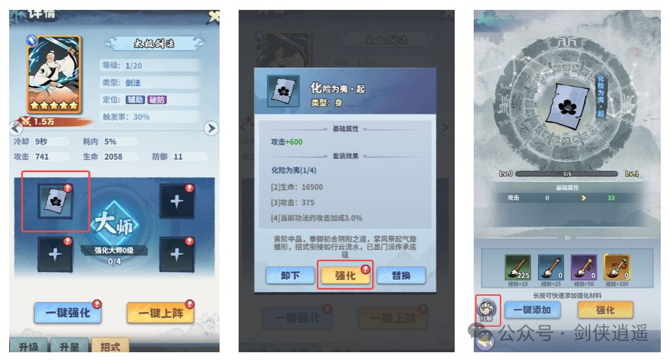 2.招式分解有多余招式可以进行分解获取招式强化材料,分解入口需要先点击强化,然后才能看到分解入口注意:分解强化过的招式会很小很小的损耗