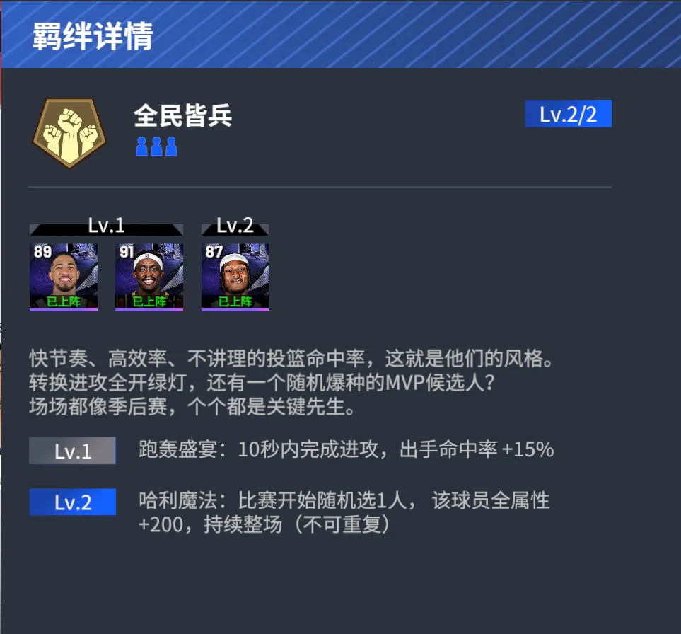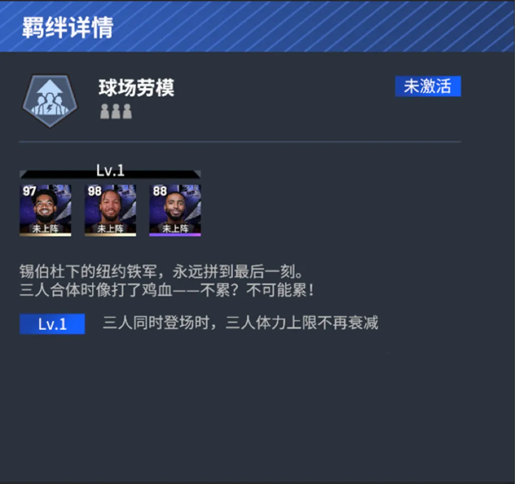 阵容羁绊是一个结合NBA IP、现实球星特质和实战机制的系统。满足特定组合条件后,球员在场上将自动触发【专属机制】或【Buff联动】效果,提升策略感、收集欲望和操作差异。(此效果仅在王朝模式中生效)