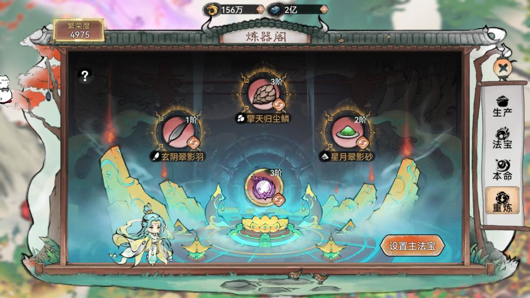 将一阶羽毛设置为主法宝,在拥有月卡的前提下,重练时会返还所有的材料并额外消耗500点灵玉。并消耗1000点灵玉进行新法宝的制作。