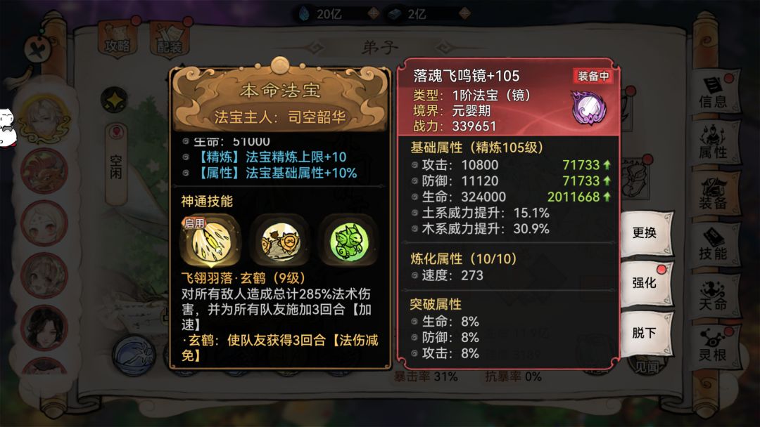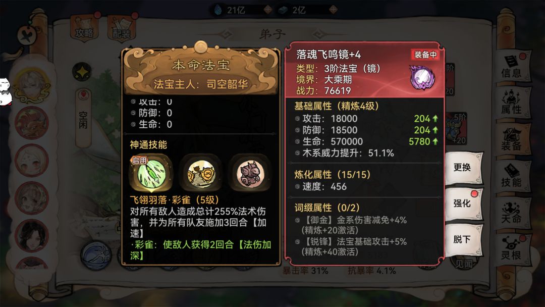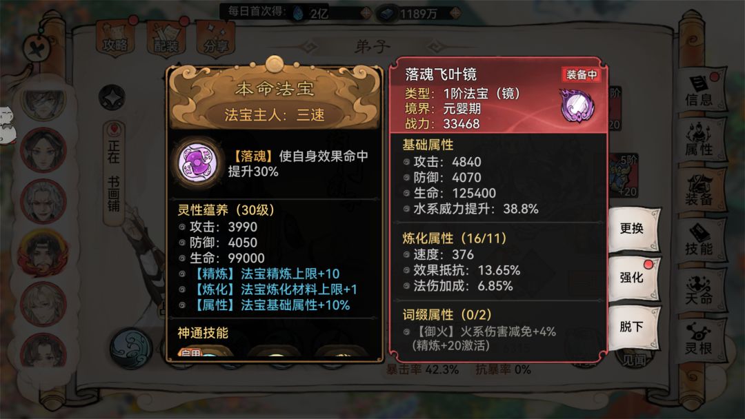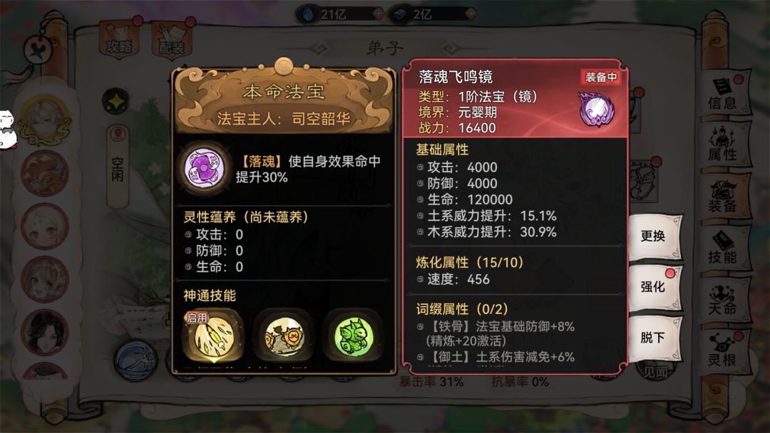 以上为一个普通的三阶法宝,制作完毕后炼化属性为(15/15)速度可达到456点。在拥有12个天河的前提下(实际只使用了11个),精炼可达到90级,可增加12%的速度,裸装备司空速度可达到3303点。但实际6个天河即可突破到85级获取12%速度加成的突破属性。