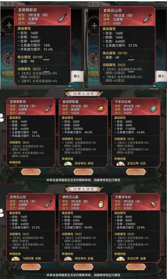 1.由于炼化属性已经锁定了所以第二次使用的主法宝只会影响属性威力提升,其他所有属性在本命法宝中并不会有体现,虽然用两种不同的方式做了两根不同的羽毛,但在重练成为法宝时只有属性威力提升方面有所不同,在炼化速度方面没有区别,都依然还是之前的(15/15)456点。