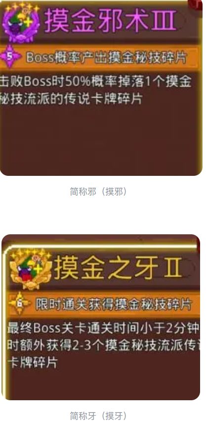 重点:邪可以让boss掉落xx流派的卡牌碎片,牙可以在通关时获得xx流派的卡牌碎片(注:牙的通关时间标注了是打最终boss所花的时间,并非总通关时间)