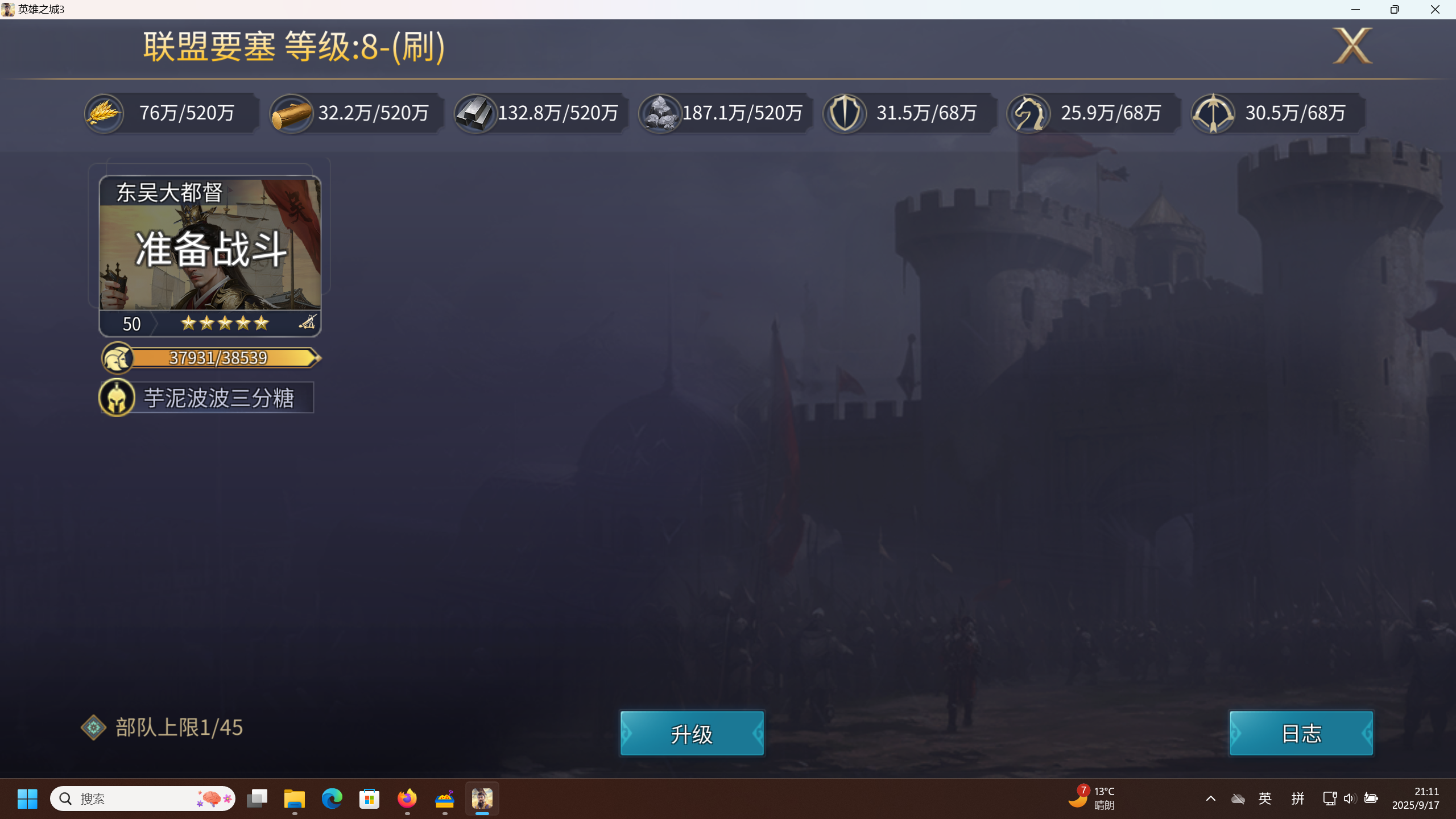 如图,将联盟要塞升到高级别,提高要塞内资源容量上限。之后,向要塞内塞满资源和兵员,如果你有小号,可以用小号来做,如果没有,就在大号资源充足的时候,运资源到要塞,以备不时之需,这也算一种变相的储蓄了