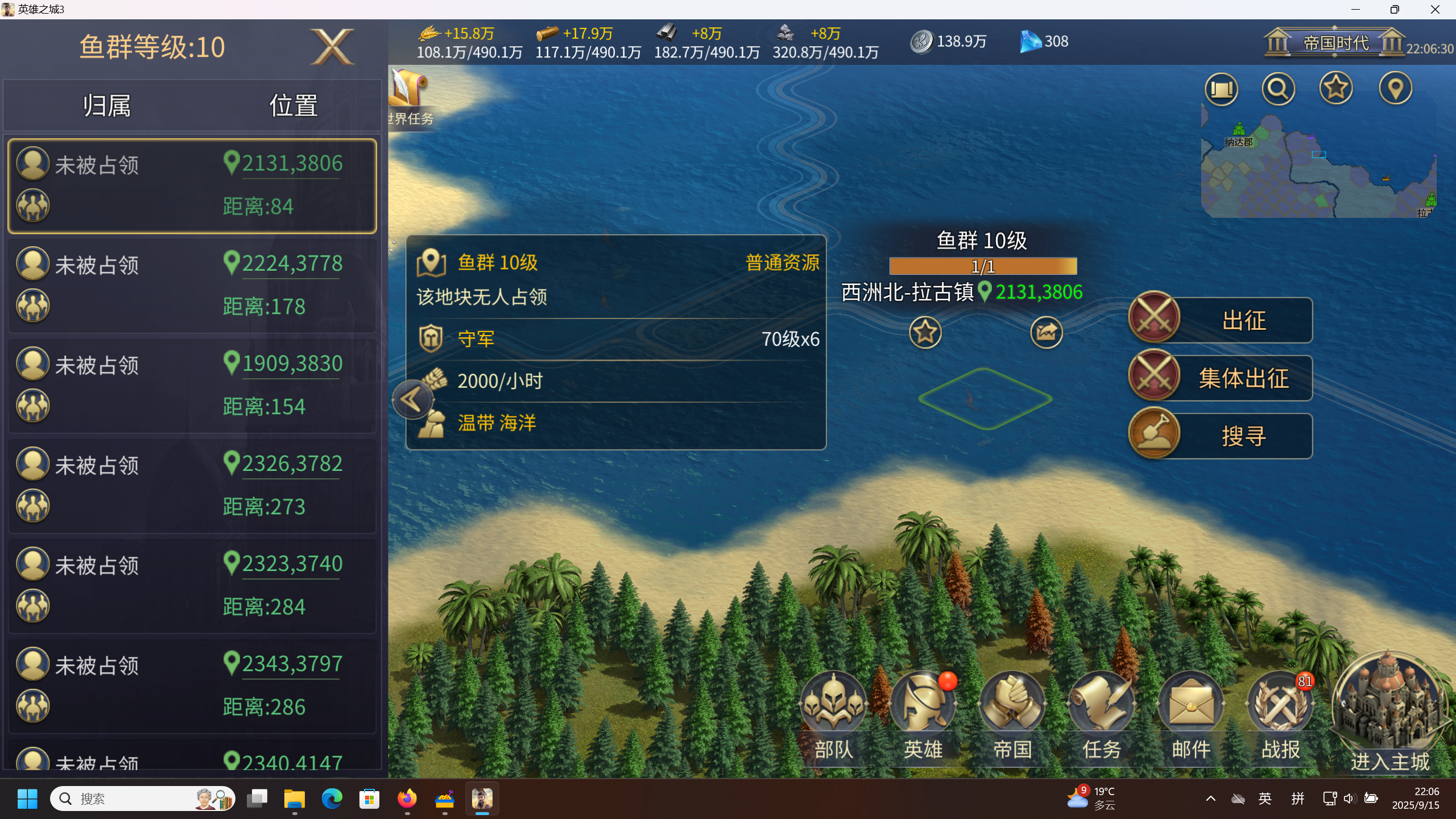 鱼群要略低于同级别农田的产量,不过,它不像名城内的高级农田,需要占领城门后才能打,更重要的,如上文所说,大多数玩家都容易忽略这种粮食资源,因此数量很充足。所以,如果你粮产不足,将主城坐落在热带气候名城的海边,当一下午的钓鱼翁,也是一个好选择