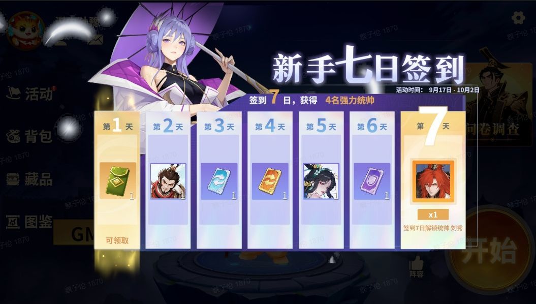 活动时间:9月19日到首测结束活动内容:累计签到14天,可以获得【互动信物】、【手气卡】、【名望】、【换将卡】。