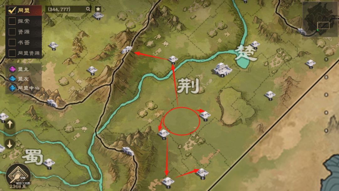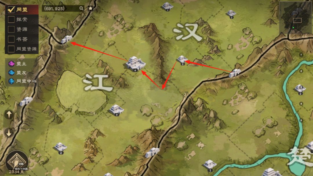 主要应用场景如下,倘若我军在箭头处被敌军打掉官署,左上领土与中心府城不相连,但有同盟府城的存在同盟领土仍然可以生效。府城数量较少各位主公合理安排府城位置。