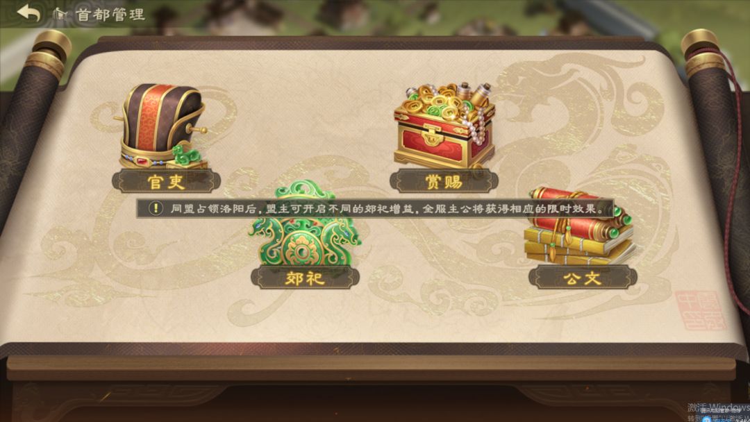 拿下洛阳可以拥有丰厚奖励,与此同时攻占洛阳的同盟盟主会成为该服的“皇帝”。