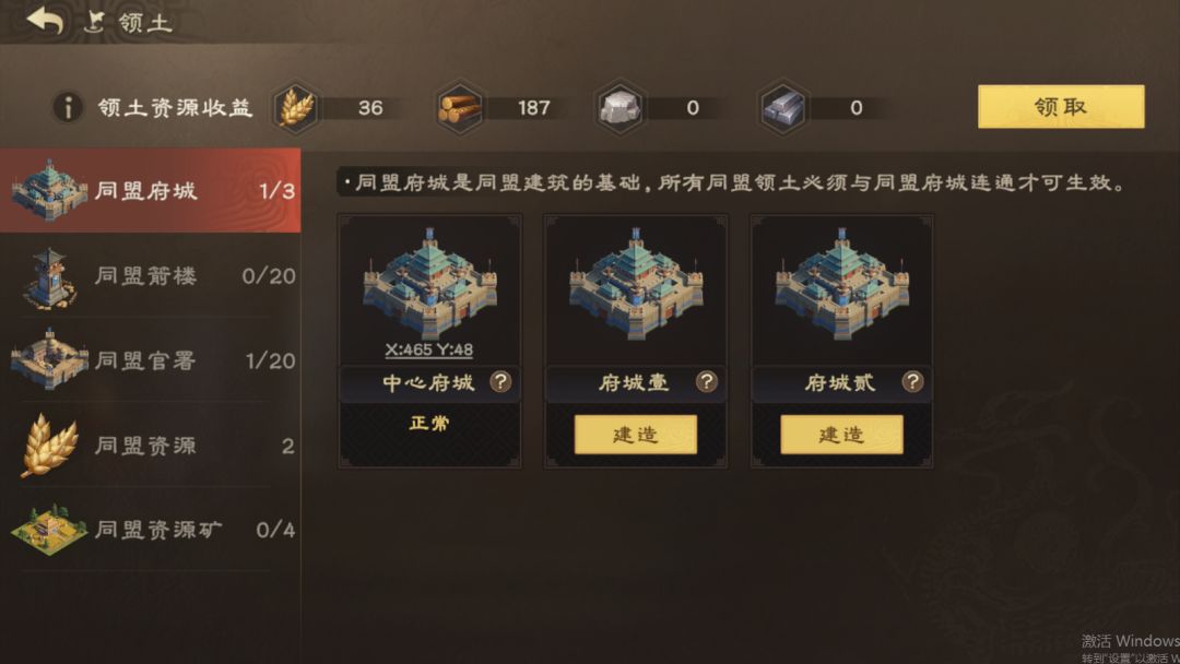 同盟府城是同盟建筑的基础,同时我们的所有领土要与府城链接才可以生效。只有领土相邻的城池才能创建攻城大营进行攻城。其中,中心府城只能建在同盟创立州。
