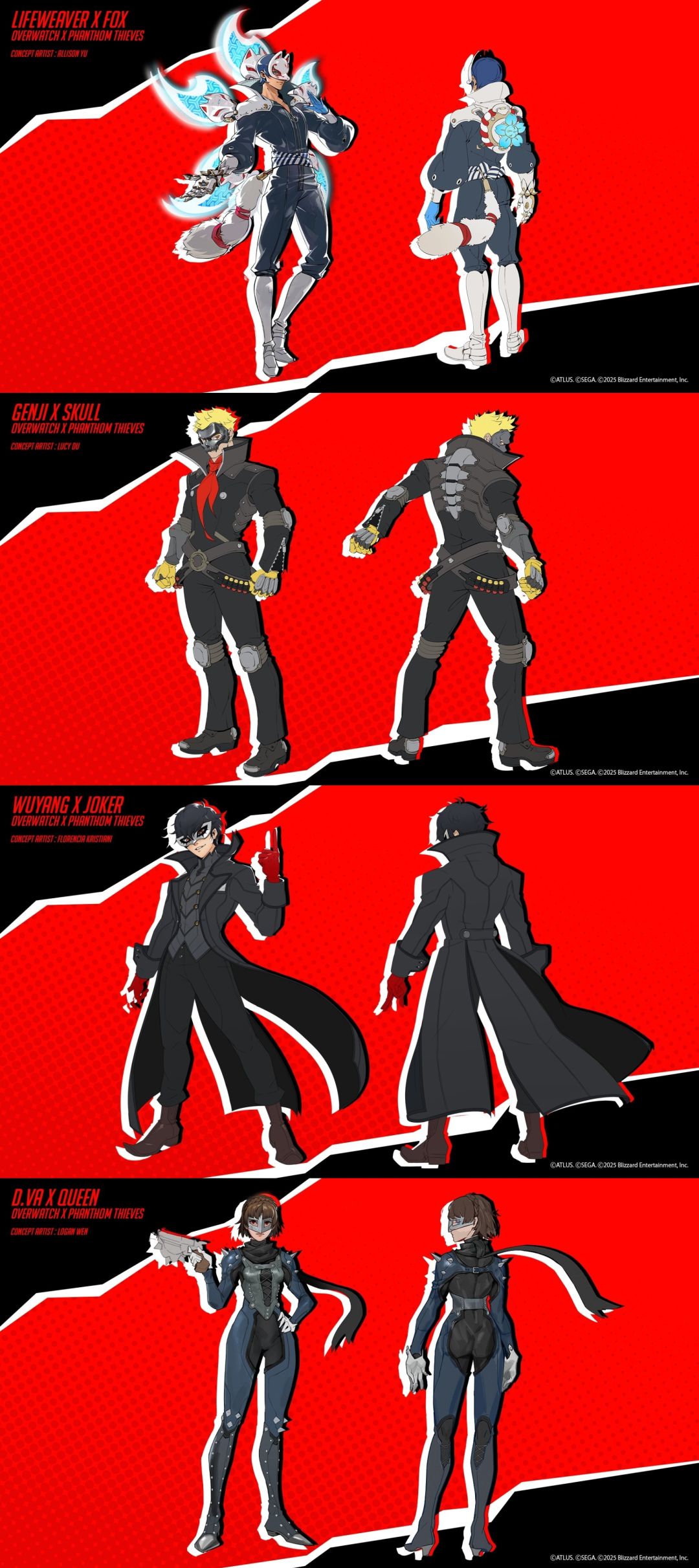 开发团队释出了多张联动内容的设计图和游戏实机画面。从公布的素材可以看出,所有角色都完美还原了《女神异闻录5》原作的美术风格,同时保留了《守望先锋》系列标志性的角色设计特色。