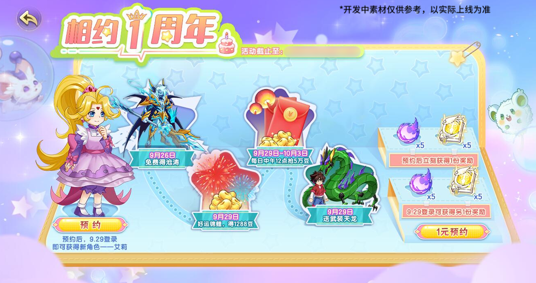 参与[相约一周年]活动预约,即可在9月29日联动开启时领取【艾莉】角色外观(为独立角色,不可与其他装扮混搭)。9月29日~10月28日预约活动将转为签到活动,若有错过预约活动的小西普,在9月29日版本更新后参与签到活动,累计签到5天即可领取【艾莉】角色外观。