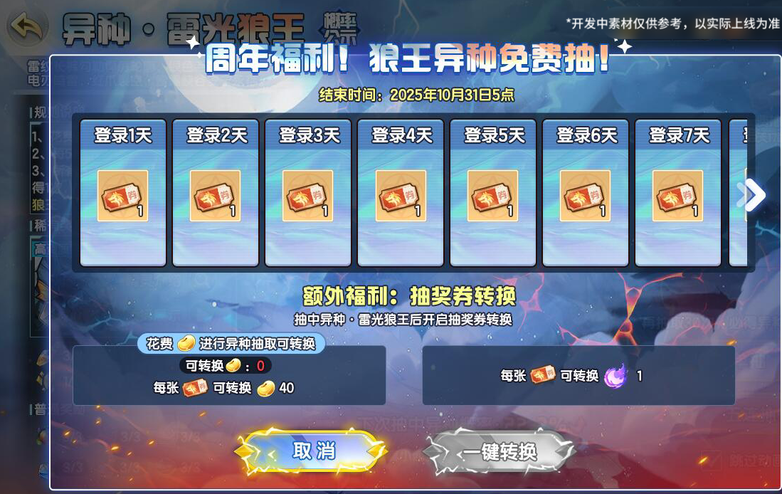 9月19日版本更新后~10月31日5:00期间,累计登录30天,每日可免费领取1个抽取道具(即活动期间内累计可领取30个抽取道具)。在获得异种精灵·雷小狼(一阶精灵)后,小西普们根据如下规则可对抽取道具进行转换: