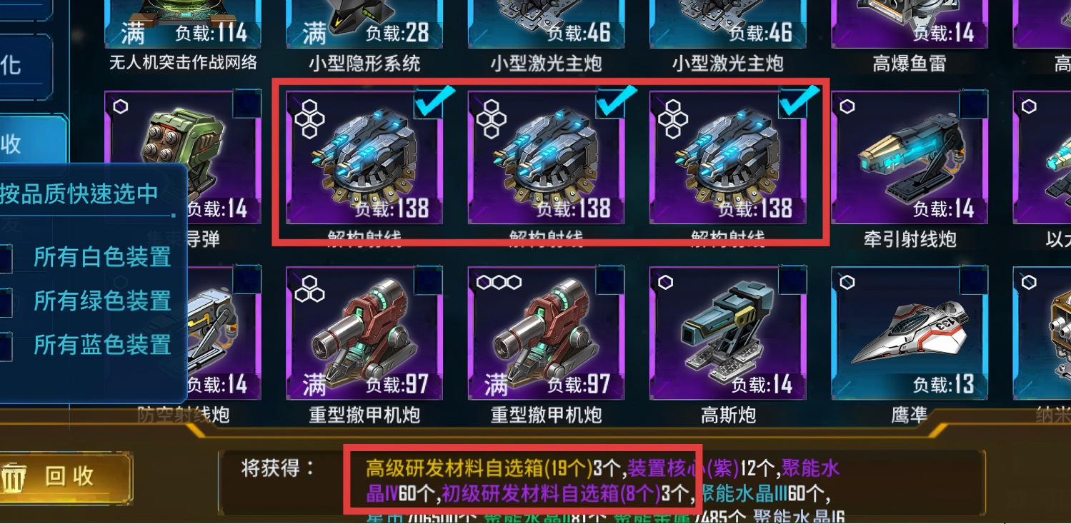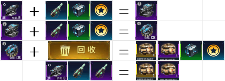 三阶解构射线+分解=蓝色研发自选宝箱+紫色研发自选宝箱+全额强化材料退款