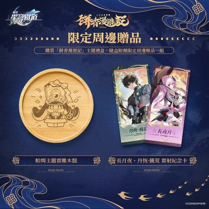 礼盒内含4款精心制作的《星穹铁道》主题糕点,口味别致且呼应角色主题,「长夜月」为松子莲蓉与奶黄流心,「丹恒·腾荒」则搭配古早卤肉和蜂蜜柑橘风味,巧妙融合传统与创意,香气浓郁、口感丰富。随盒附赠精致可爱的【帕姆主题雷雕木盘】一枚,以及两张闪耀的【长夜月 & 丹恒·腾荒镭射纪念卡】。外盒采用专属设计图案,每购一盒更赠送一款主题手提袋,就是可惜大陆地区暂时不售卖这个联名月饼礼盒![[TapTap表情|TapFamilyxdoro2_粉狗叹气]](https://img-tc.tapimg.com/market/images/4084524c71328966328d81308cdce6ac.gif)