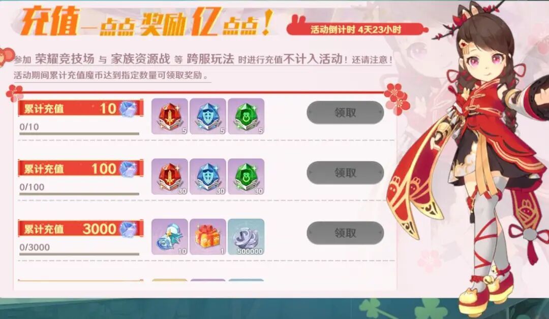 *需要注意的是,参与荣耀竞技场和家族资源战等跨服玩法时进行充值,将不计入活动。