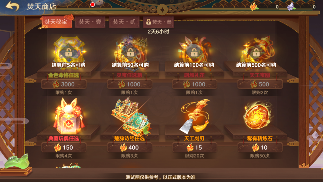 ● 焚天商店将迎来奖励更新,可兑换蛮熊疾鹰碎片二选一、净尘莲蕴、灵霄星召券、祝星石等珍稀道具,守护使大人记得前去看看呀~