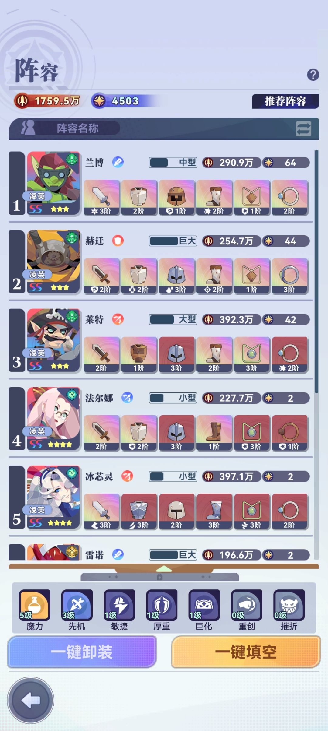 六人阵容过渡推荐:冰芯灵,法尔娜,咩咩,兰博,莱特,雷诺。主要是易获取、易养成。