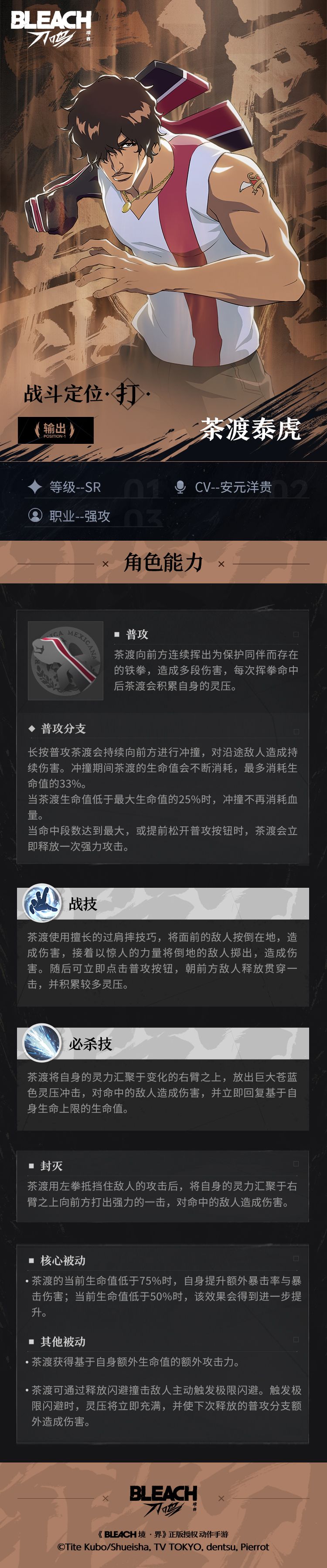 游戏中的茶渡也是一名可靠的输出型角色,依靠“变化的右臂”对敌人造成大量伤害,是团队中值得信赖的同伴。一起来感受他的力量吧!