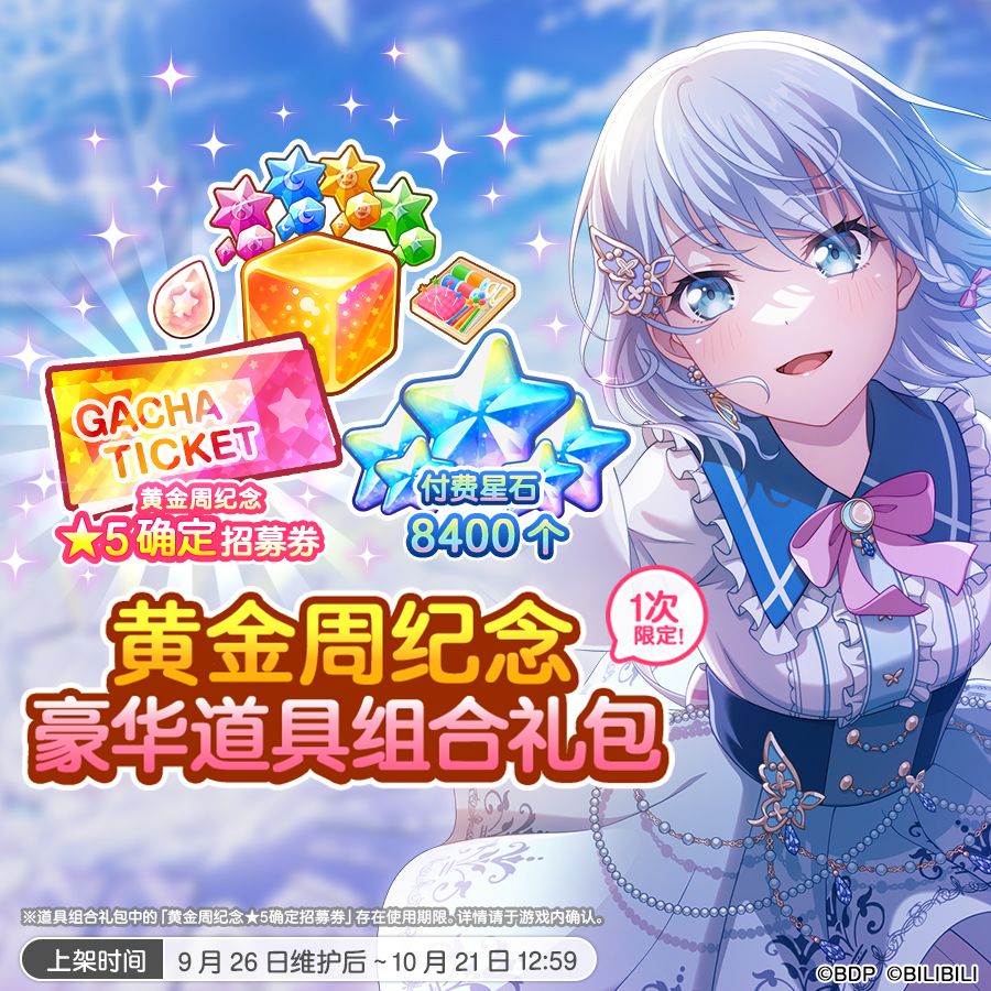 为庆祝黄金周庆典活动开启,游戏内将于9月26日维护后,上架豪华礼包「黄金周限时纪念豪华道具礼包」和「黄金周限时纪念高级道具礼包」,购买对应礼包可分别获得★5确定招募券×1、★4以上确定招募券×1、大量付费星石与养成道具,超值礼包不要错过呀。
