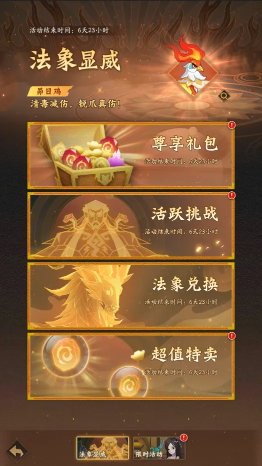 专属活动「法象显威」来袭!活动期间,道友们可通过完成【活跃挑战】或购买【尊享礼包】进行法象兑换,更有【超值特卖】活动限时开启!具体活动内容如下: