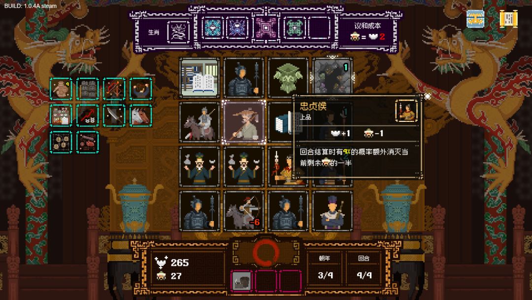 玩家需要生存四个朝年,每个朝年有三波攻击,每波攻击我们要坚持4个回合(根据随机事件的影响,回合数会有变动),每一朝年的最后一波攻击会在我们的牌组里随机刷新BOSS,厉害的比如尸妖,会传染给周围的人类,而且不可消灭,极大影响我们消灭贼寇的效率;弱一点的比如类似黄巾军的贼寇,每回合复制同样的数量,也就是最后一回合会变成8个,只要前面几个回合把贼寇清掉在安全线以下就好。