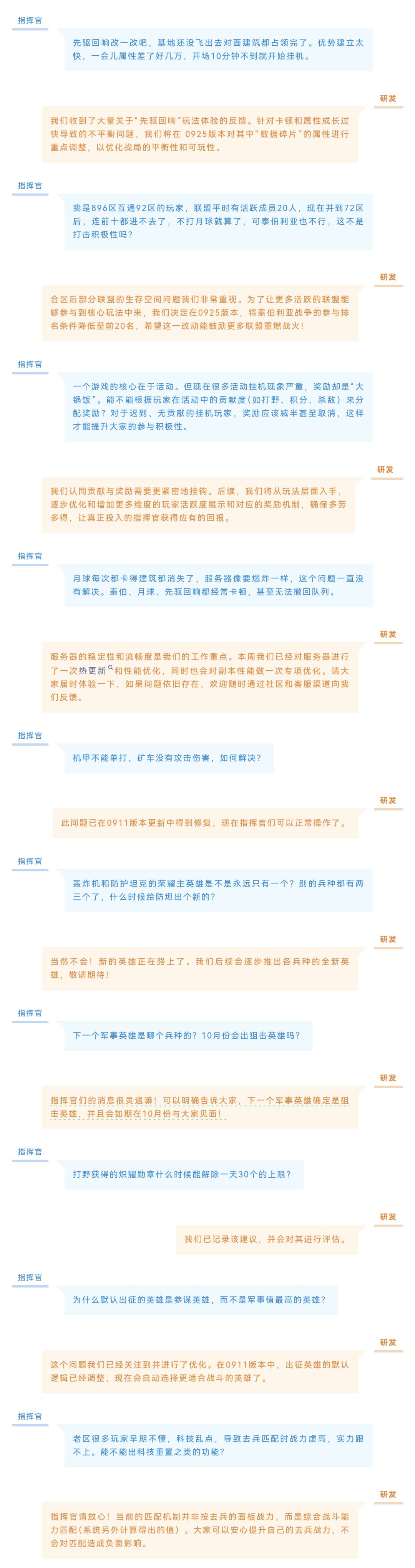在9月5日的“策划面对面”问题征集活动中,我们收到了许多来自指挥官们的热心提问和宝贵建议。大家的每一条反馈,研发团队都认真阅读和讨论,并针对大家最关心的问题,给出了相应的解答和未来的优化计划。