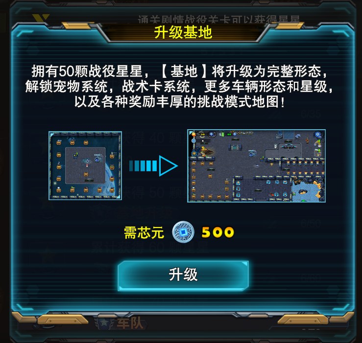当我们在战役中积累到50颗战役星星时,【基地】将迎来重大升级,进化为完整形态。这一升级意义非凡,不仅增加了宠物系统,让我们能够拥有可爱的战斗伙伴,还进一步强化了战术卡系统,同时开放了更多车辆形态和星级,为我们的战斗阵容提供了更多选择。此外,各种奖励丰厚的挑战模式地图也将向我们敞开大门,等待我们去探索和征服。