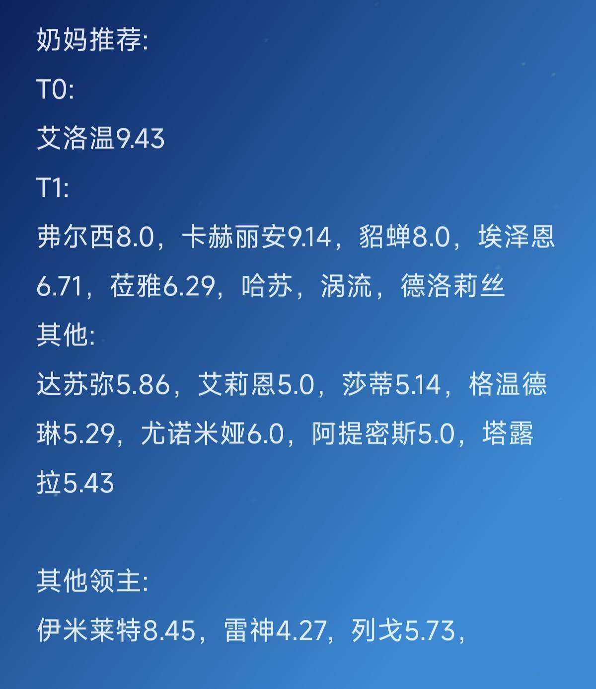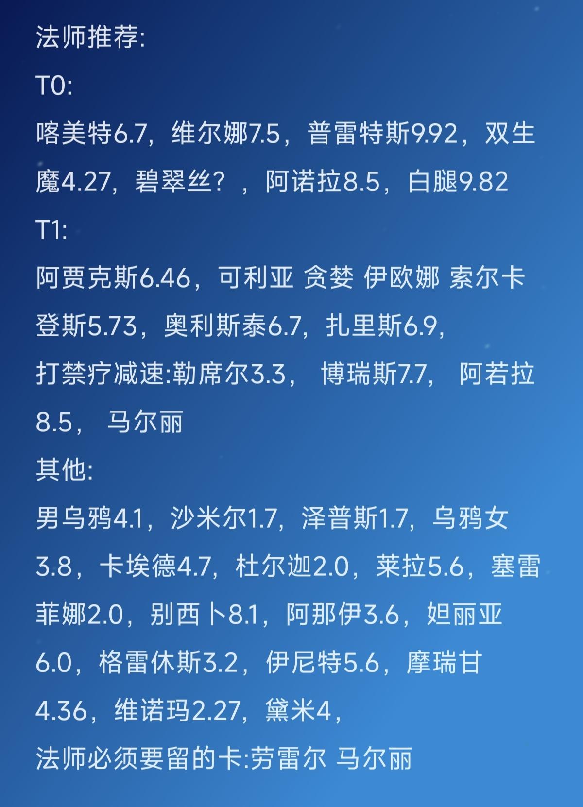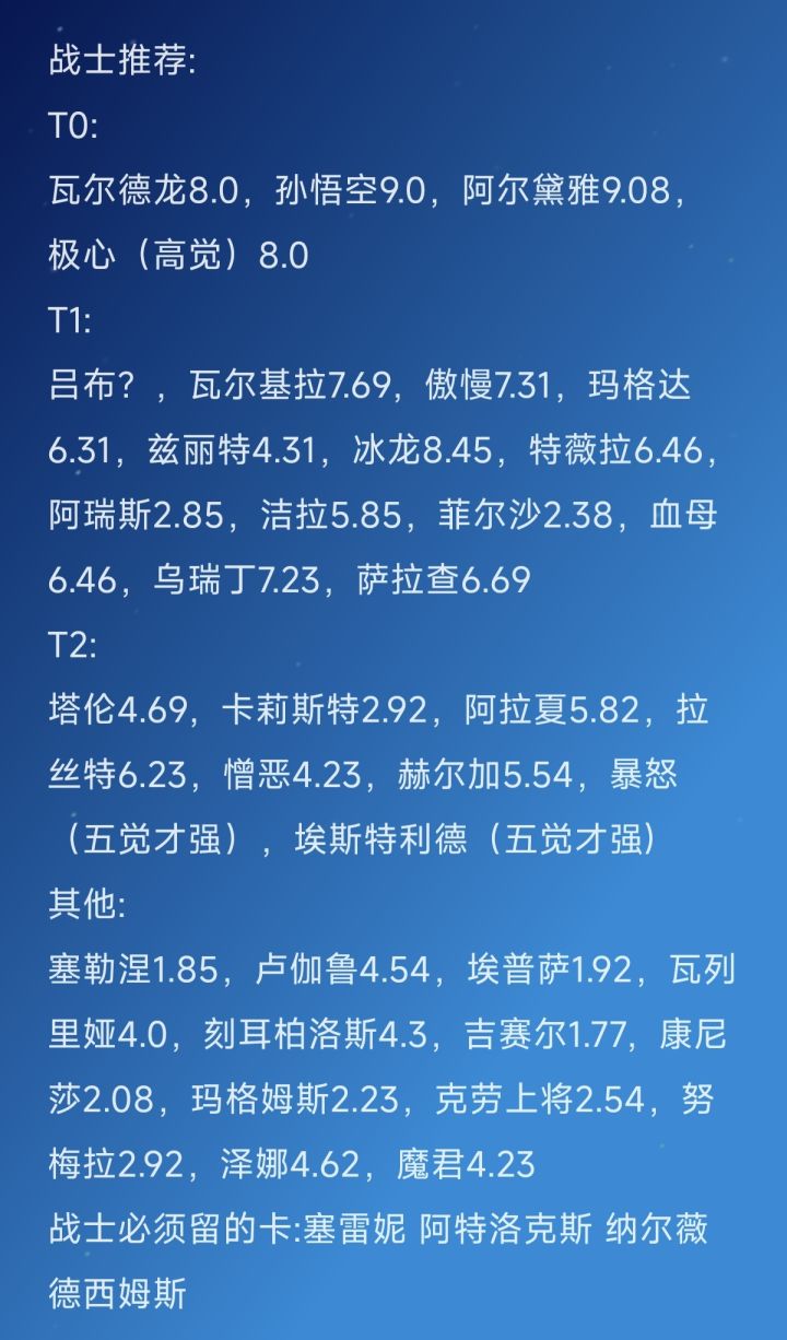 一般来说,新手教学可以抽卡后,用邮箱资源抽完哈苏池子,升级一坦克一射手一法师,一奶,即可轻松通关第三章,之后继续抽卡,抽哈苏和法老,弋德莉尔必培养。10级在任务里,有一堆关注公众号给50钻石的任务。以下的T度为新手推图期T度,评分为b站UP主巴洛克会长的10分制评分(游戏后期英雄评分,也就是分越高越值得长期培养),见图示。