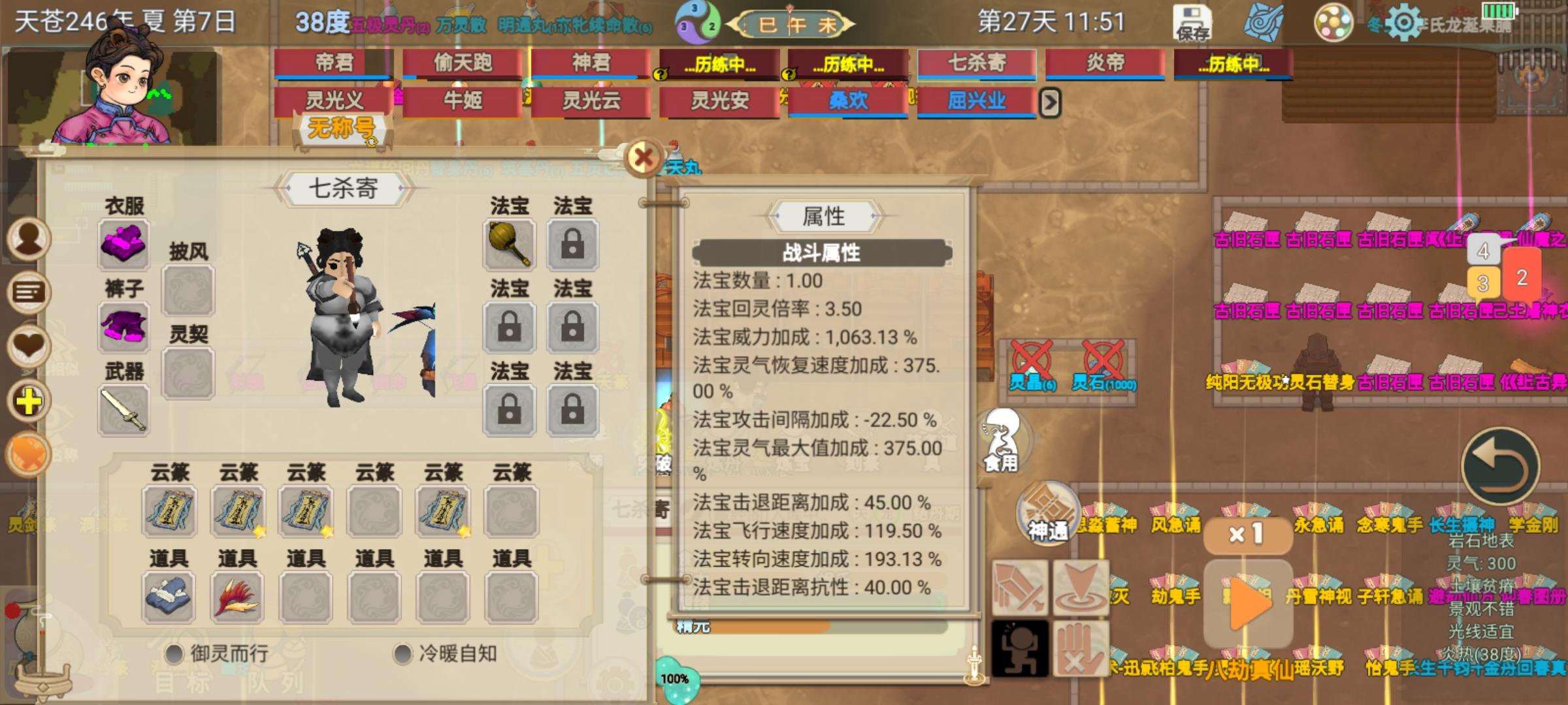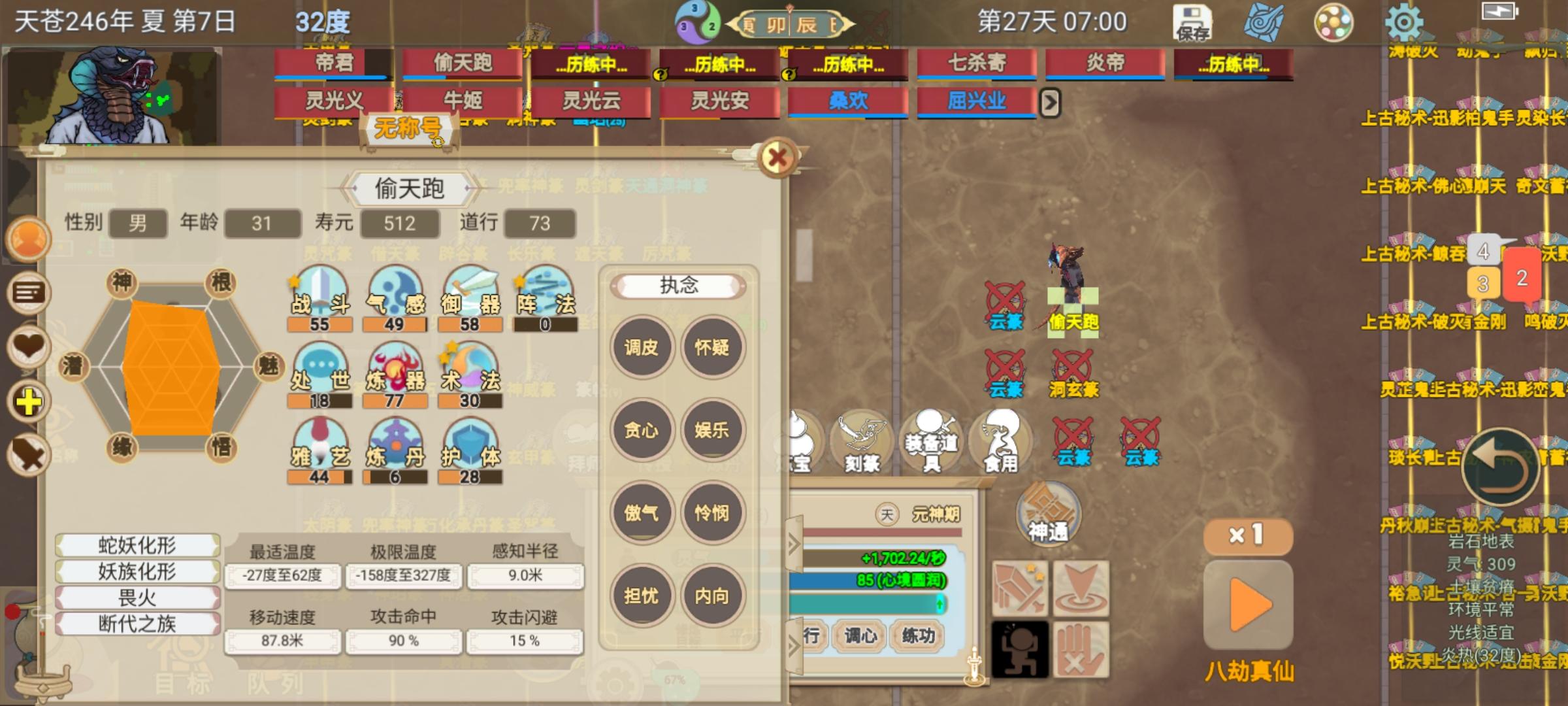 偷天跑突破元神,卸下“修炼符”,带上“科技减道符”吃“龙涎果”学习《历练》、《灵气》、《御灵》、《附灵》、《道淬》、《重生》、《星斗之眼》、《三阳赤心咒》等技能。学完道淬三个“紫阳丹”、“地母灵液”、“三花丹”、“万灵散”、“紫色毁丹”。