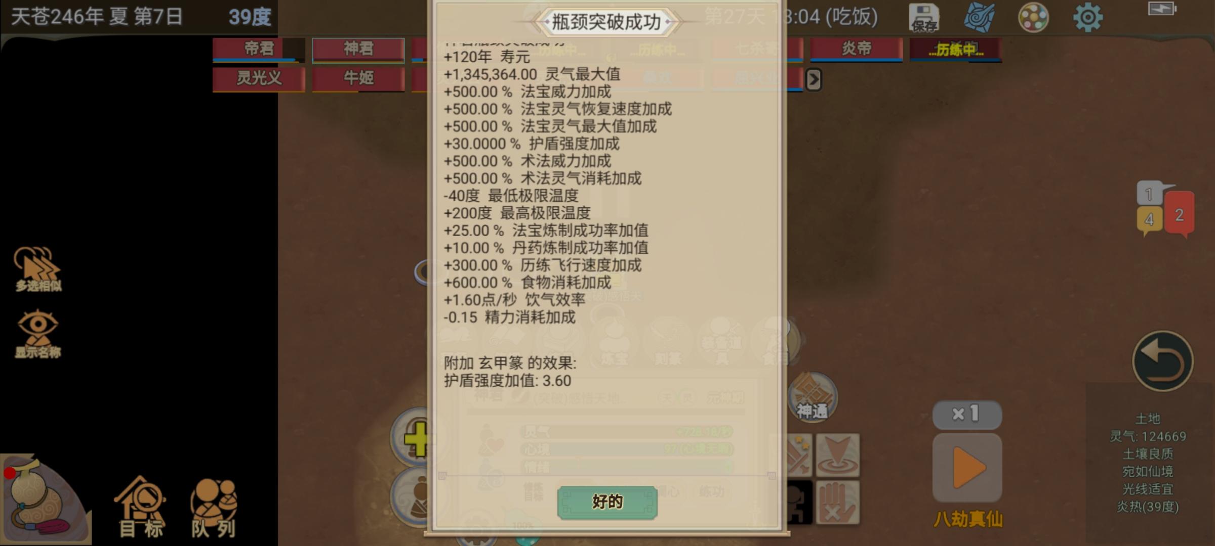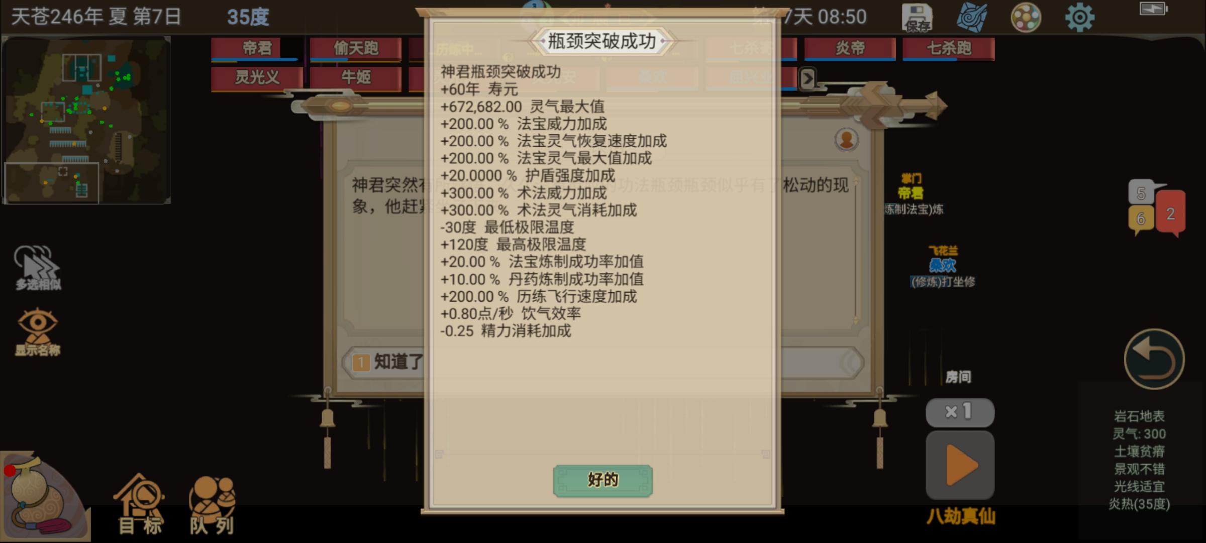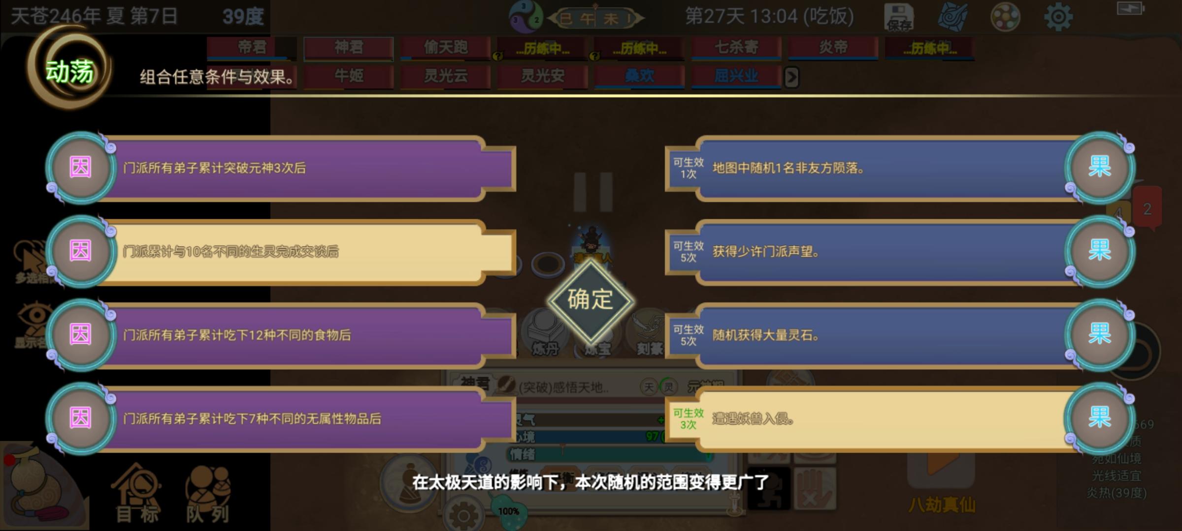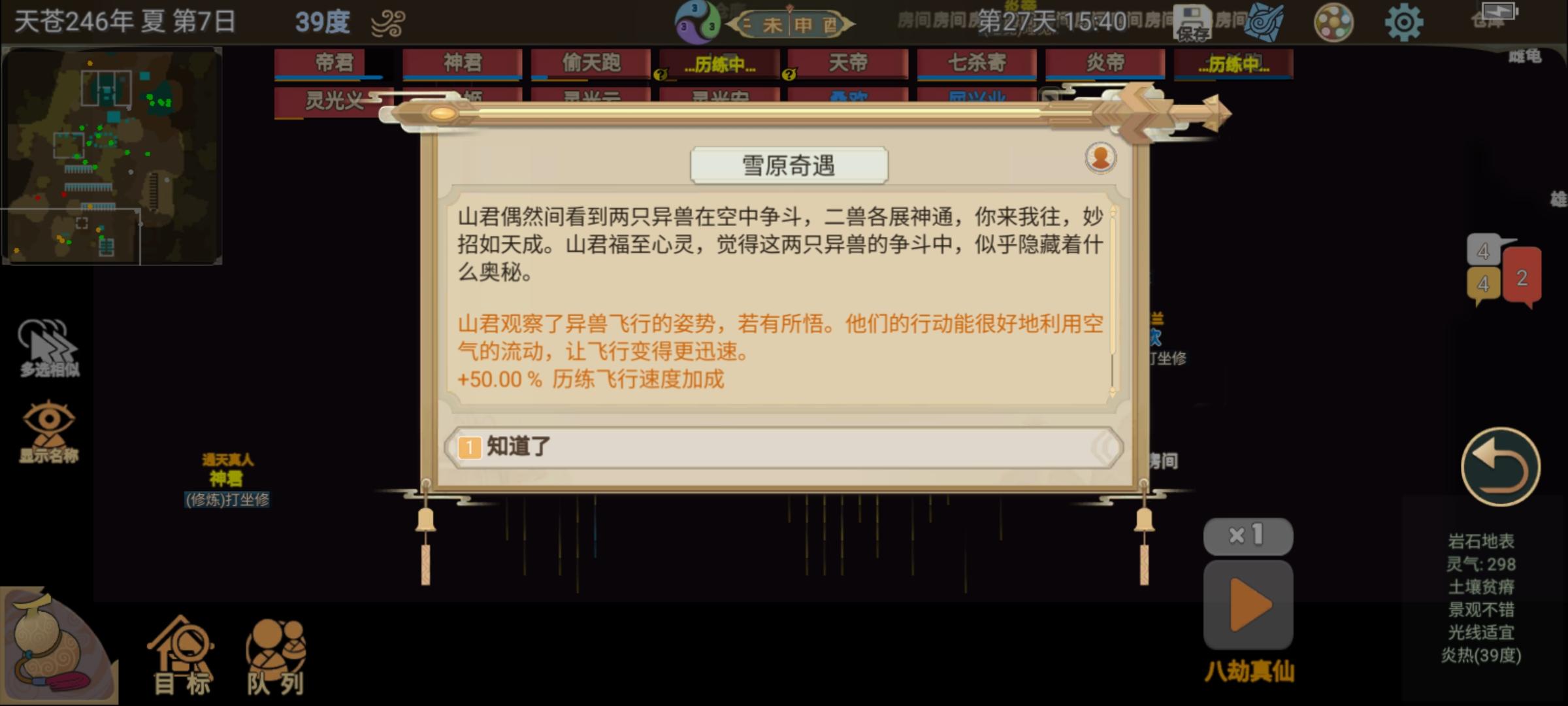 突破随机的动荡异动,看自己喜好选,我选的是妖兽,妖兽等级可以去野外挂机提升,挂50多天袭击的妖兽差不多是元神期,这样就可以刷老虎坐骑加御器,其他元神妖兽杀了刷宝物也行。条件是和生灵对话,比较好触发。