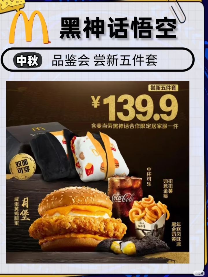 据透露,此次联动麦当劳将推出6款限定新品,分别为黑金奶黄年糕风味派、如意金箍扭扭薯、咸蛋黄鸡腿蛋月堡、咸蛋黄大福风味麦旋风、芝香脆鸡堡以及芝士蛋双牛黑金月堡。![[表情_流口水]](https://img-tc.tapimg.com/market/images/f0320a0494447e27b7123a94b6cbcecf.png)