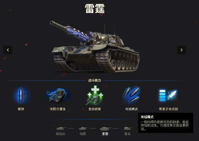 像猎犬小队的话,有四台坦克可供选择。如果要稳健的话,选择基于大巴顿的“雷霆”是不错的,它伤害够高,综合性能也不错。而且吨位够大,中后期找准机会能创飞埃尔梅琳达的电磁豹一。主动技能则是强化输出的“攻城模式”,可以快速收割AI敌军。