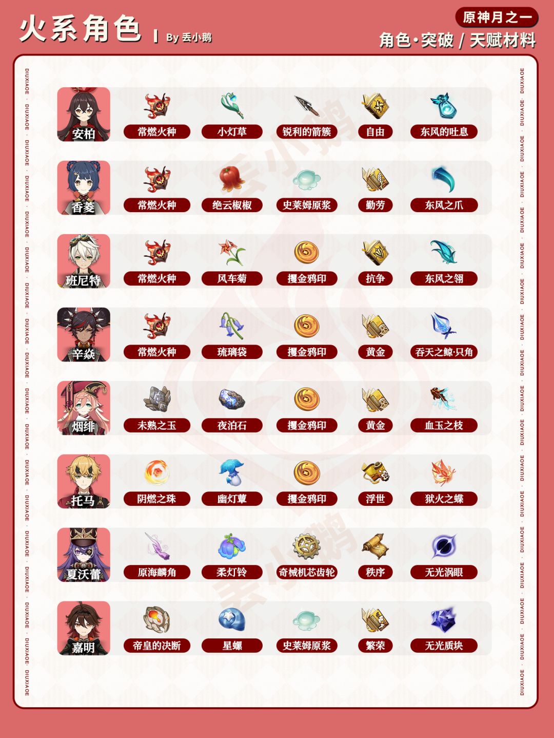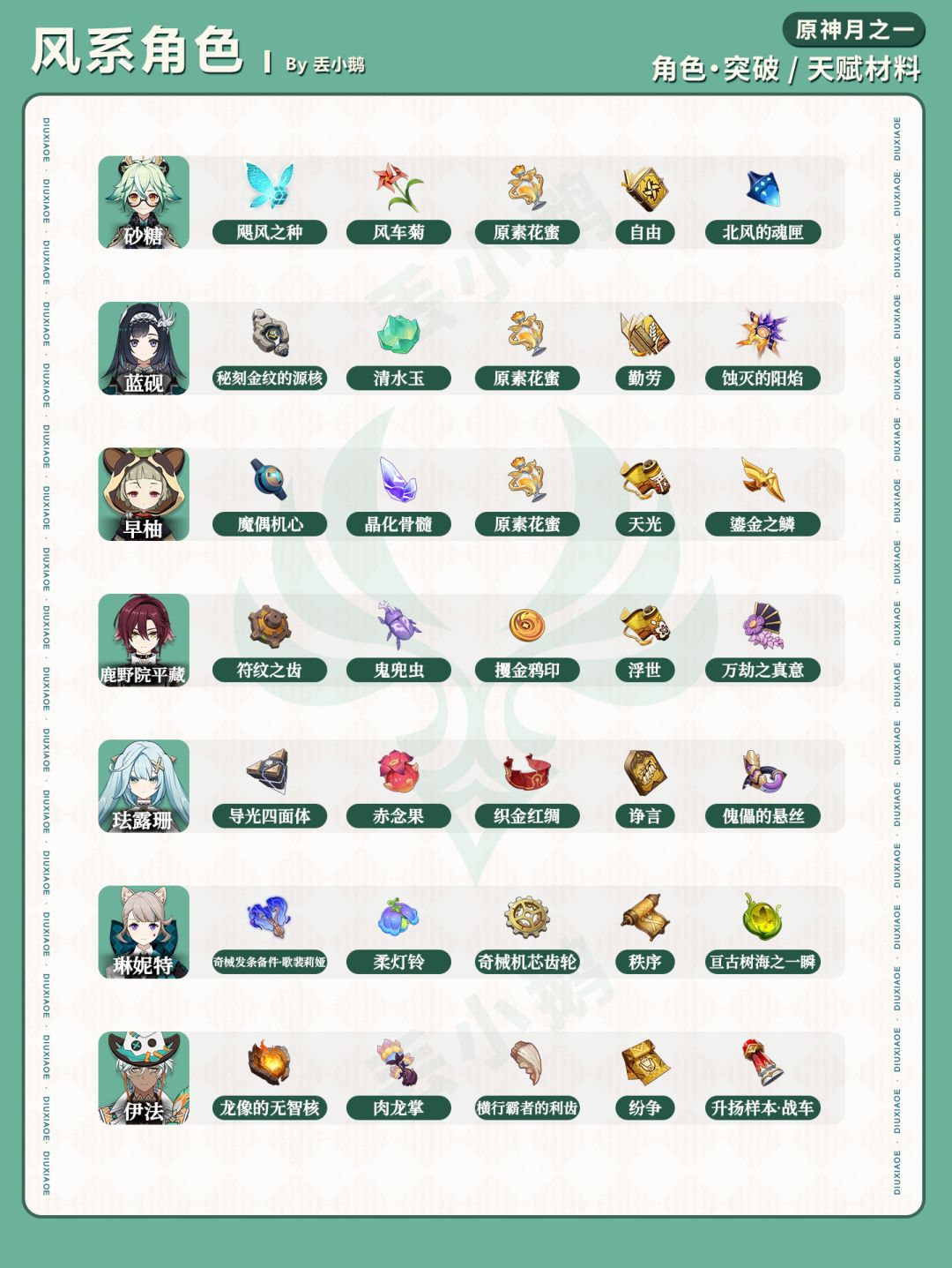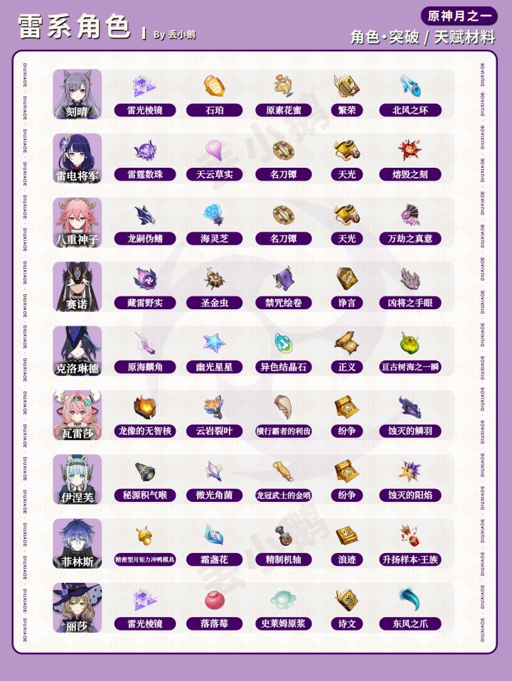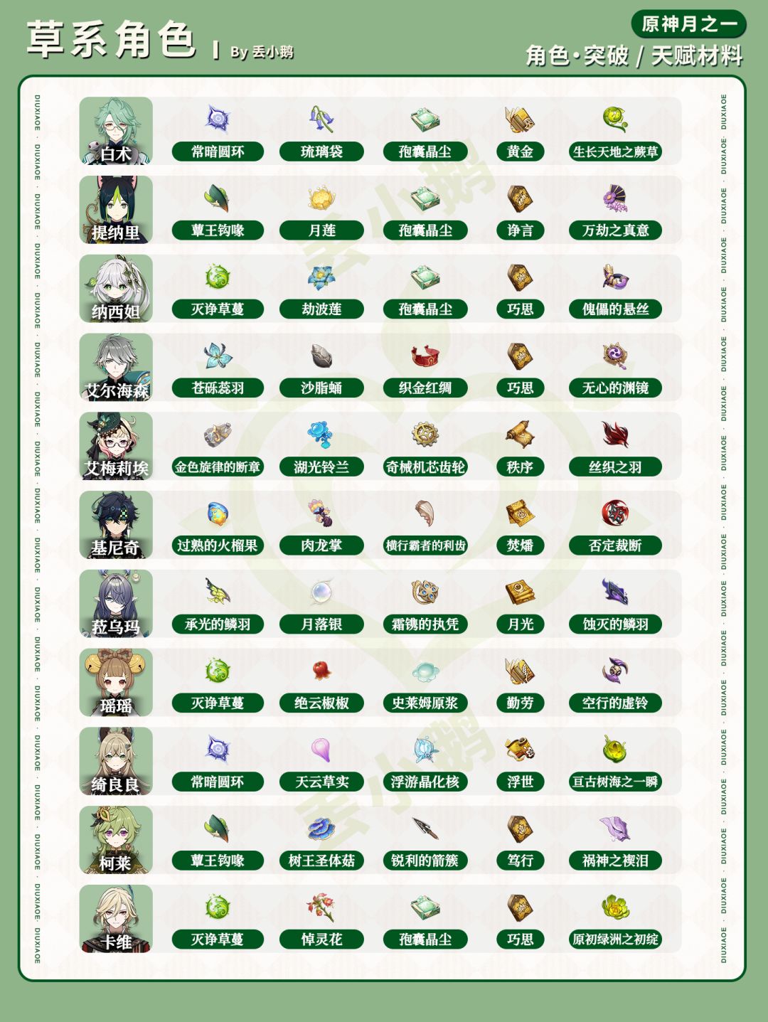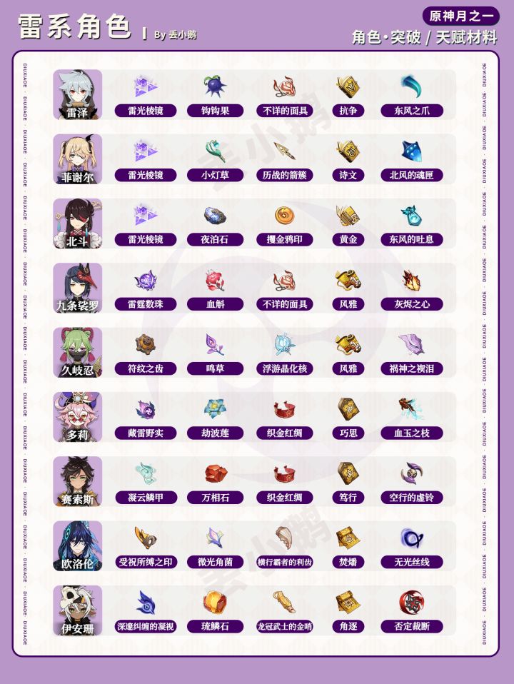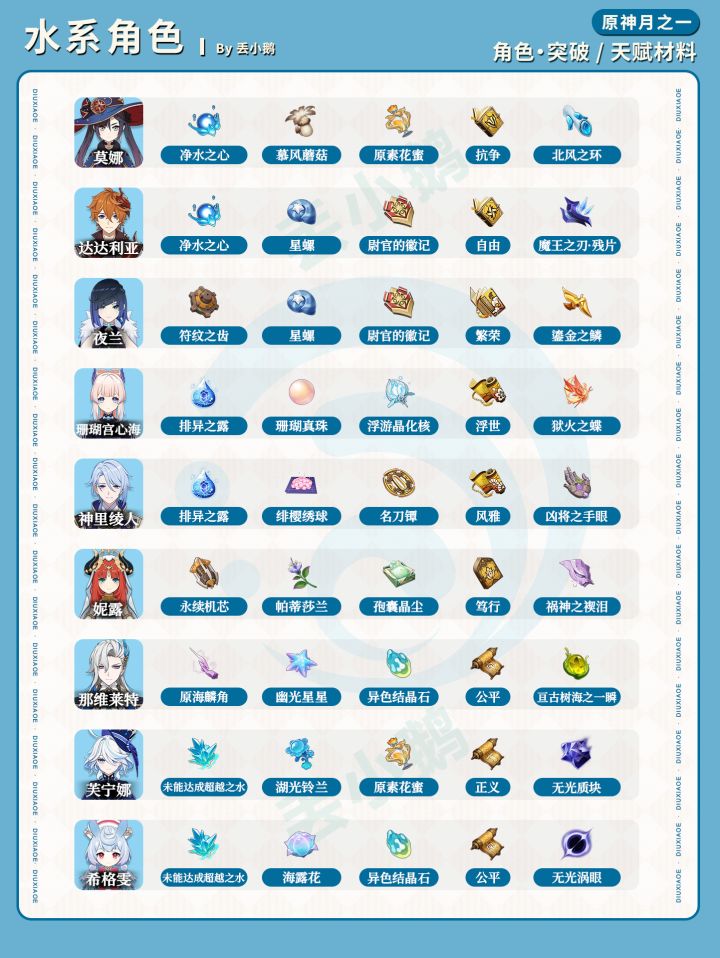 我是丢小鹅,为你带来【原神月之一】全角色突破/天赋材料一览表。