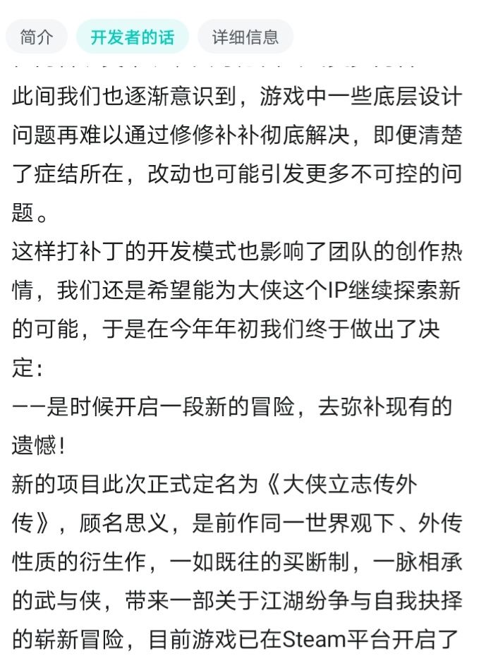 你去了解了解别的游戏,很多游戏更新的都不是新的内容充实玩法,大多数都是注重什么能够氪金,就更新什么,网友制作的扩展内容或者新图群里免费用,官方抄过去直接卖钱,还有2块钱购买2小时试用期的奇葩。网友制作的降肝的脚本软件,官方抄过去取名自动刷图,还是卖钱。一大堆神将,越来越强,也越来越贵。。好不容易等到更新个dlc卖58,68。就把玩家当韭菜割。。我今年碰到四五个这种游戏了,才又回来继续玩大侠立志传的!!