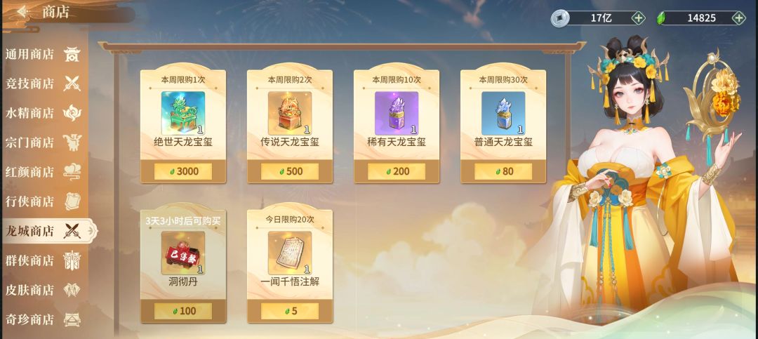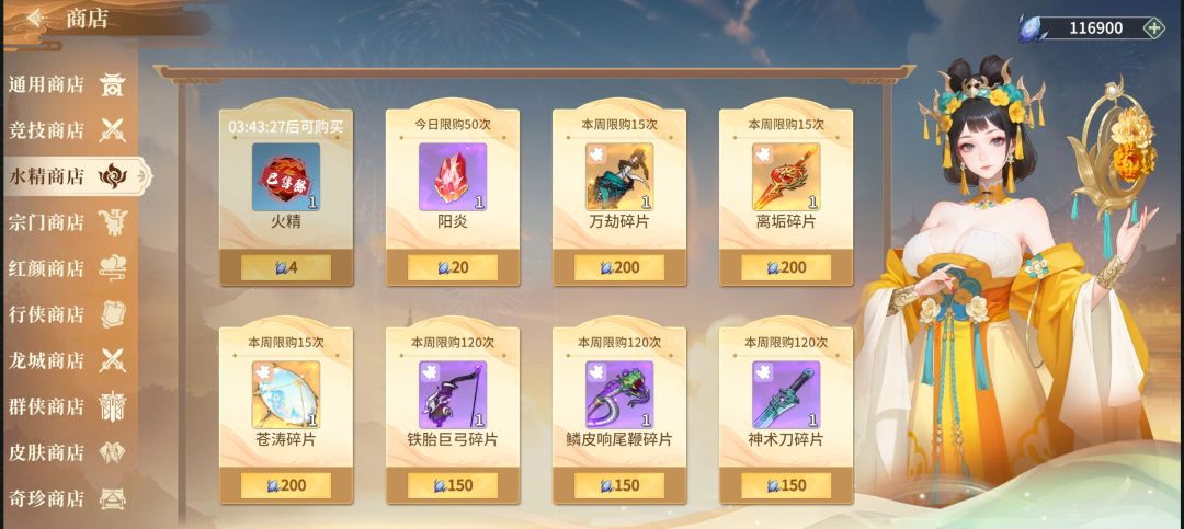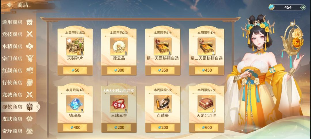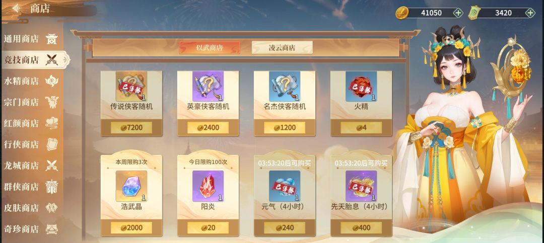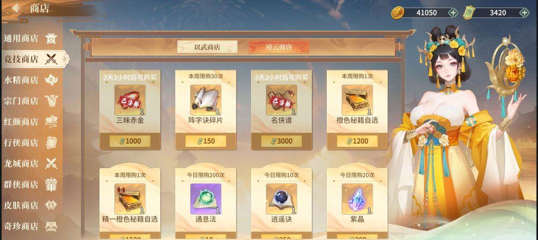 竞技之凌云商店:三昧赤金(买),名侠录(买),阵字决碎片(可买)