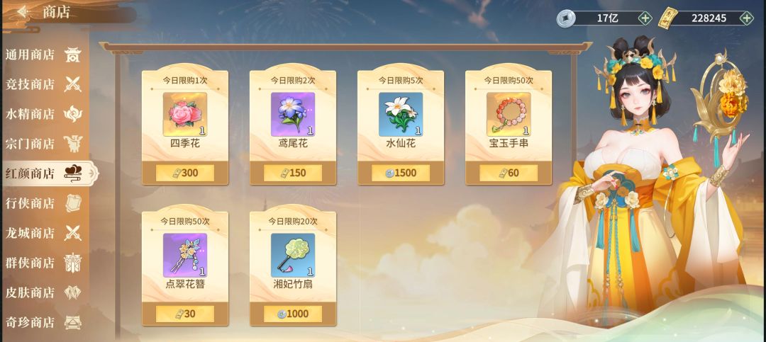 通用商店之入世楼:杜妆怜(前期买),鱼映眉(有条件可买),元少眉(中后期可买),叶曼色(中后期可买)。