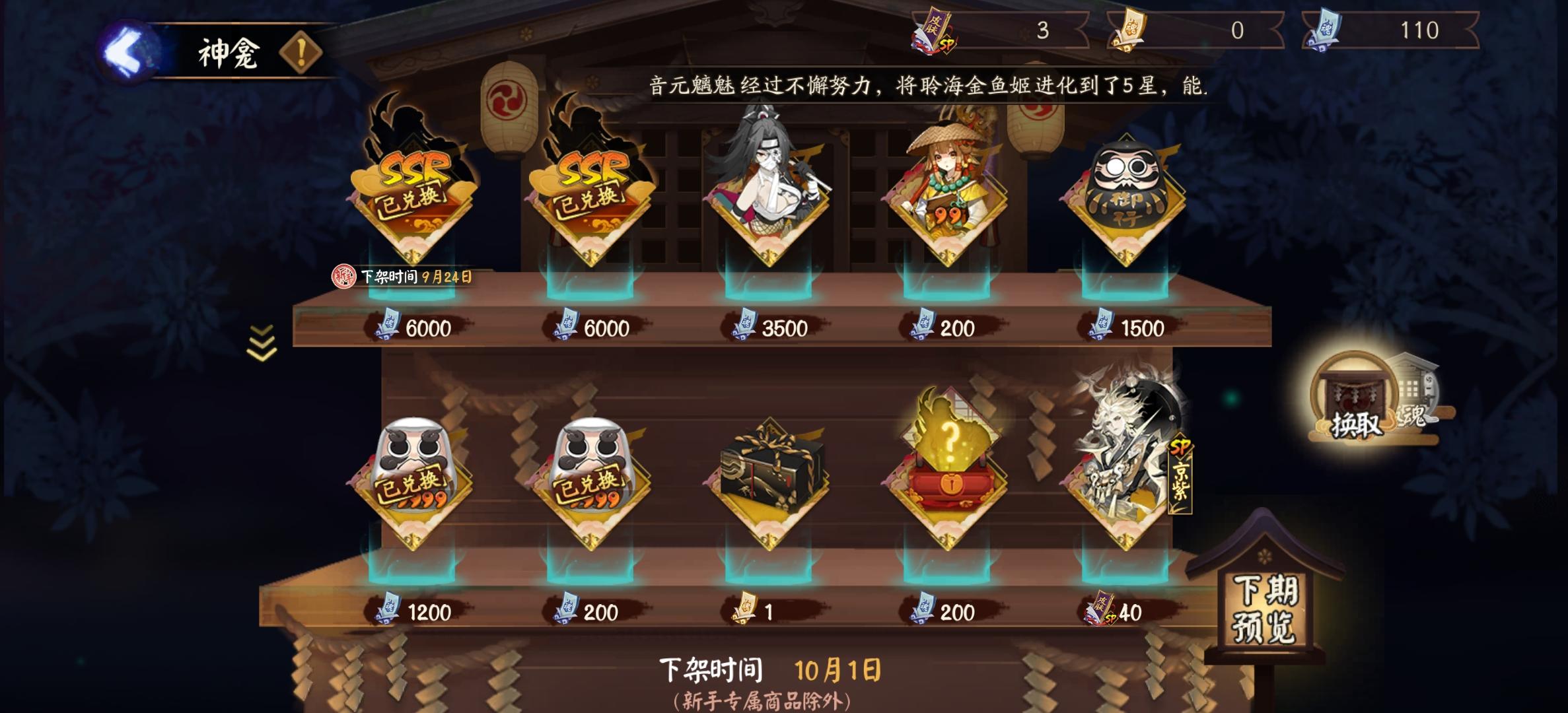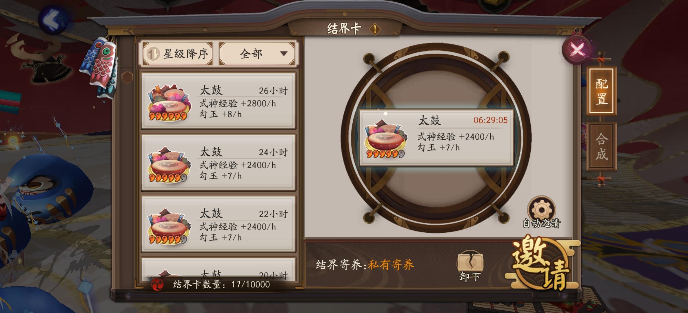 抽完了500还存了几十抽,黑蛋拿满了,成就肝了很多,目前图鉴开启情况ssr23.sp10,PVE式神快拿的差不多了,神龛换完了,式神八个六星,太鼓也屯了几个,现在看看假全图要多久完成,坐等平将门养老