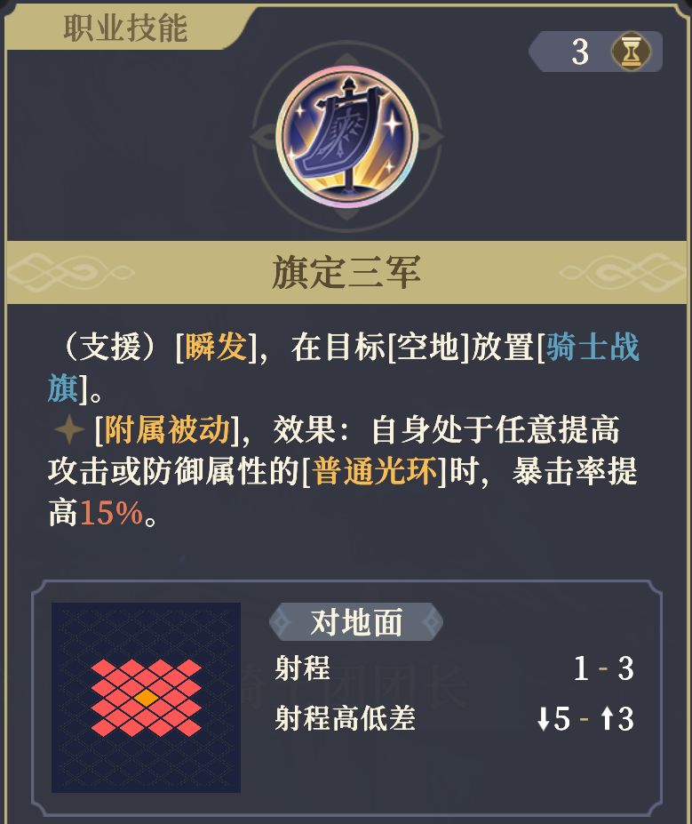 选择一个己方单位,使其范围3格内所有己方单位获得100%生命值的物理护盾,其中骑士同盟角色,再获得移动1、速度2及攻击2,并给除自己外的骑士同盟角色全冷却-1。