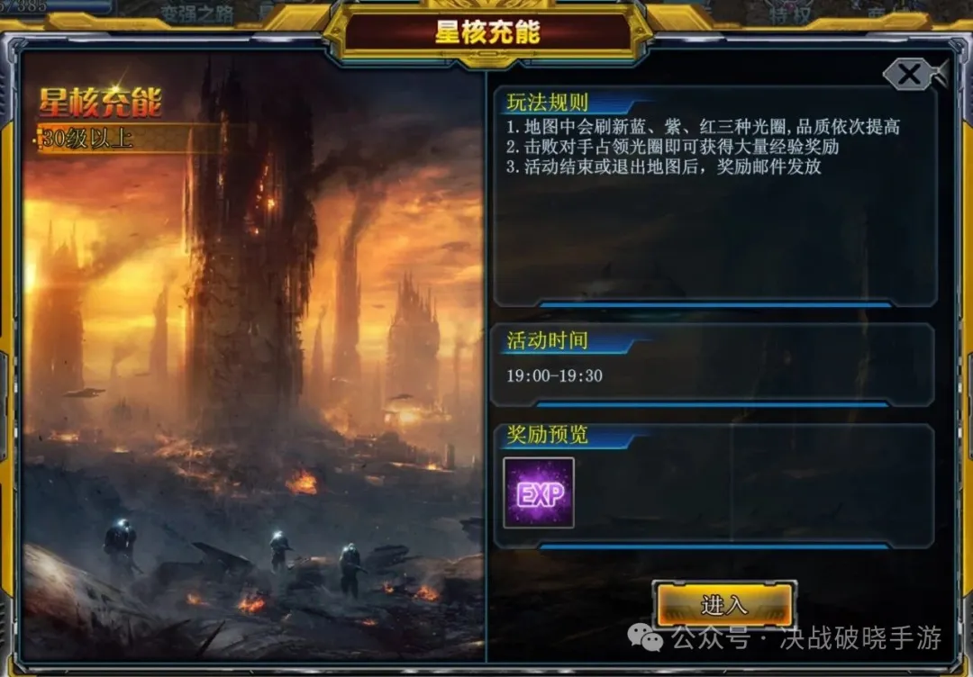 星核充能优化:高低战力各取所需!新版星核充能更公平,也更策略:增加光圈数量,经验分配按位置决定:中心圈经验最多,边缘圈次之。高战玩家抢中心圈,效率爆表;低战玩家建议野外刷怪(更新后经验增多),比占边缘圈更划算!