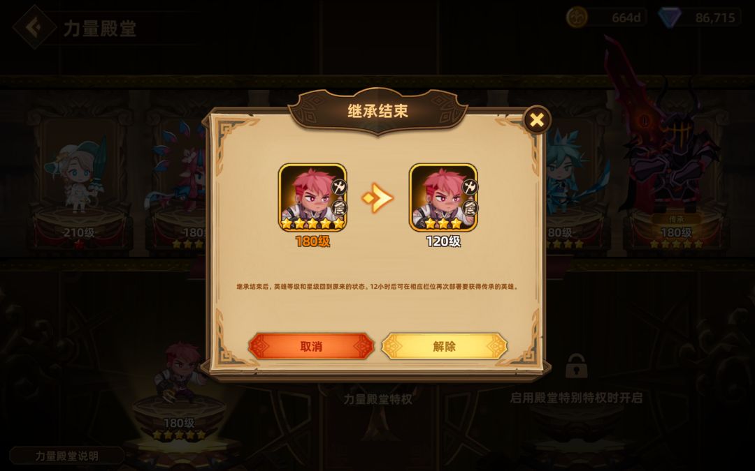 对于平民玩家,力量殿堂系统能够快速提升新获得英雄的星级和等级。如果想要在抽到二星梅菲斯托时立刻继承力量殿堂英雄的星级和等级,推荐提前12小时解除现有继承英雄,为梅菲斯托留好位置。