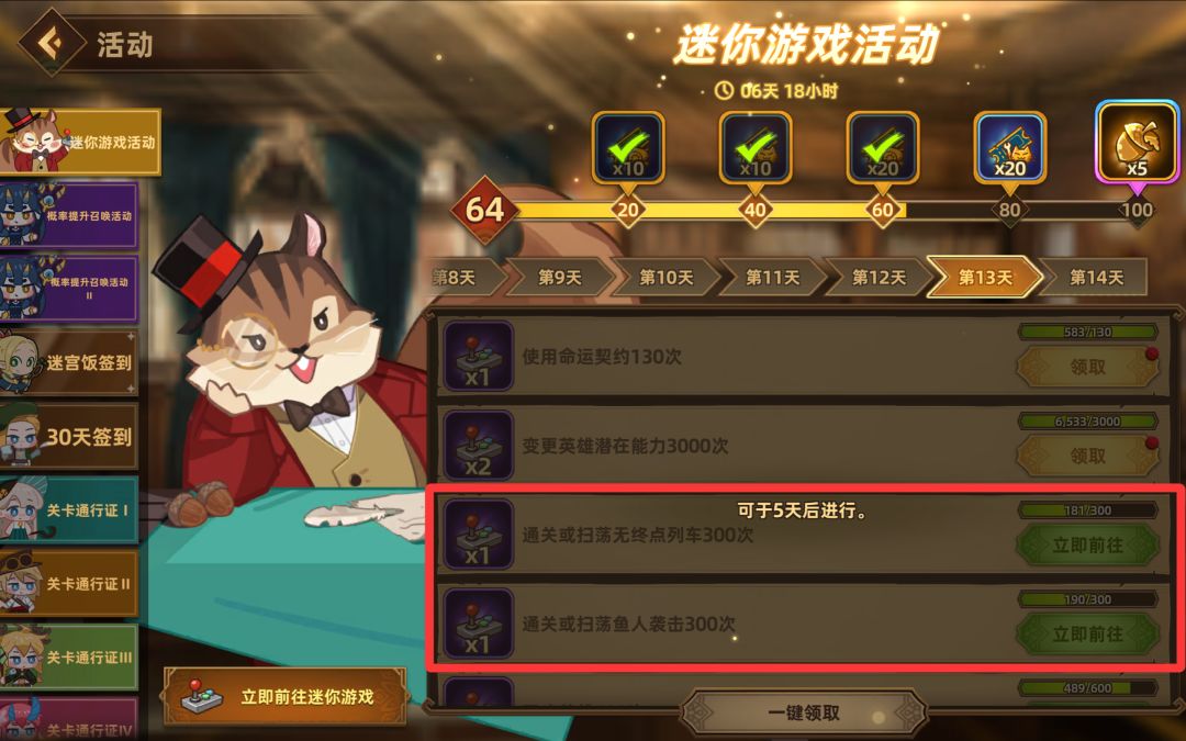 本期迷你游戏只需要完成100个任务即可拿到5个金色橡果,也就是说,即使有12个任务未完成也能拿到5个金色橡果,可根据个人追求、钻石数量等因素自行决定是否完成全部任务。