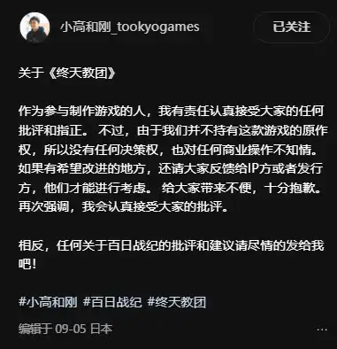 总的来说,他完成这个游戏后,剩下的工作就不再由他管了,做完就跑回自己公司专注《百日战纪》了。因此,《终天教团》首发时的涨价乌龙,小高也着实是无妄之灾。
