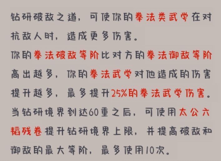 从武道大会中获得注解,钻研其他武学的长处与短处。选择破敌克制你的对手,可增强你的这一门的武学威力;选择御敌抵挡对手,可减少对手武学对你的伤害。——选自《演武场—钻研武学》