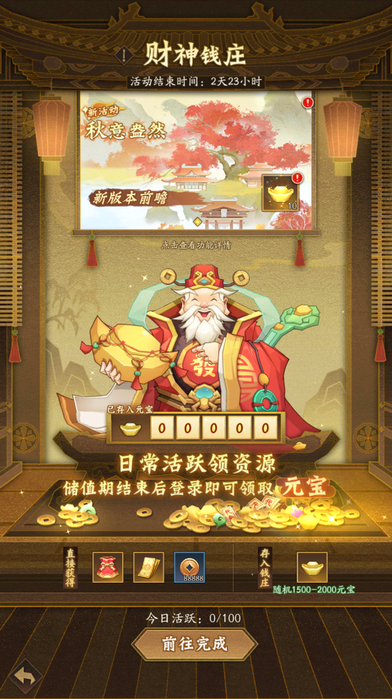 财神想借助道友们的财气,点金成石!【财神钱庄】活动总共分为两个阶段,储蓄阶段从9月17日开启,持续至9月19日,总共3日。活动开启时,道友们每日完成100点活跃后即可储存超过1500元宝,累计3日。9月20日即开启返现阶段,当天登录即可从钱庄总池中领取所有储蓄元宝。