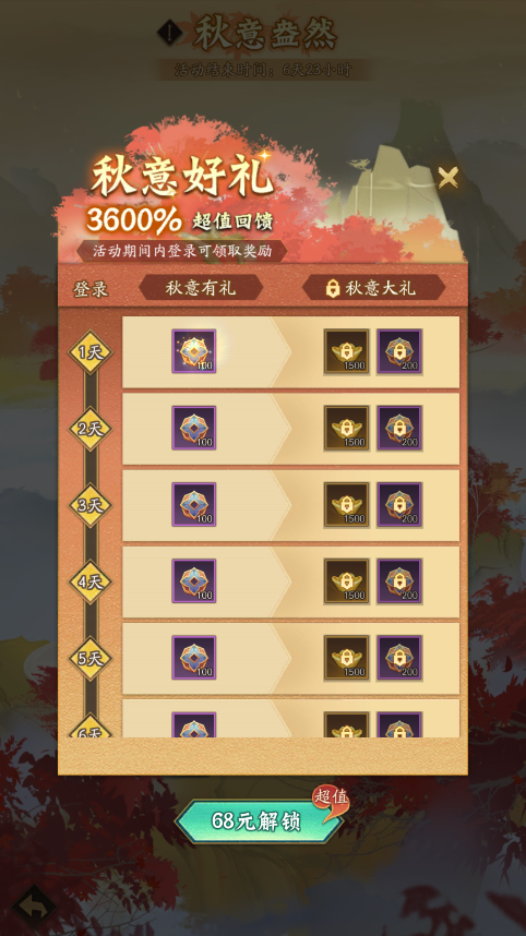 3600%超值回馈「秋意好礼」限时来袭!活动期间,每日登录即可领取免费【秋意币】!【秋意币】可用于【秋意商店】内兑换超值好礼~道友们还可解锁「秋意大礼」,领取海量元宝以及更多【秋意币】等超值好礼~!