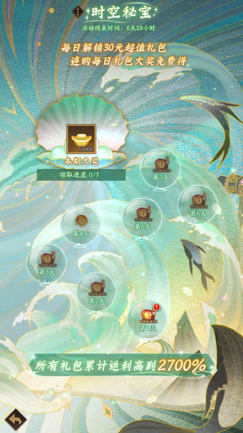 穿越无垠时空,探寻神秘宝藏!「时空秘宝」盛宴限时开启!每日登录都可解锁30元超值礼包,包含时空秘宝自选(六)【内含无双御灵碎片12选1、神兵碎片16选1、尊品法象碎片15选1、极品阵法碎片6选1】、秋意币、海量元宝等超值好礼,连购每日礼包后,还可免费领取秘宝大奖:10000元宝!所有礼包累计返利2700%!