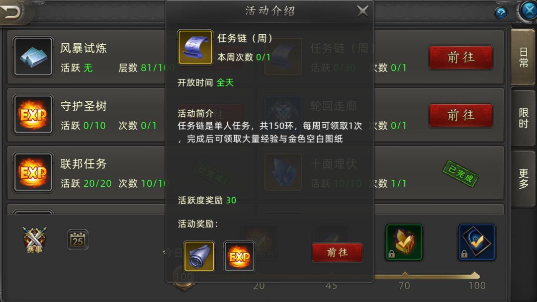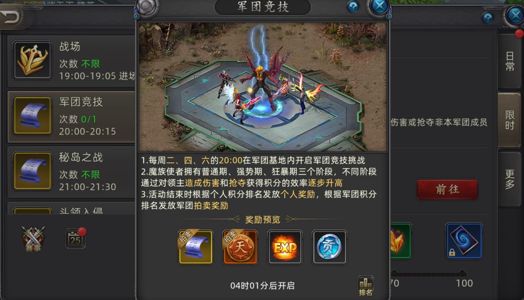 军团活动:每天晚上8点(周日除外),都有固定的军团活动。这玩意儿也简单,进去跟着大部队混,挂机就能拿经验,非常轻松。