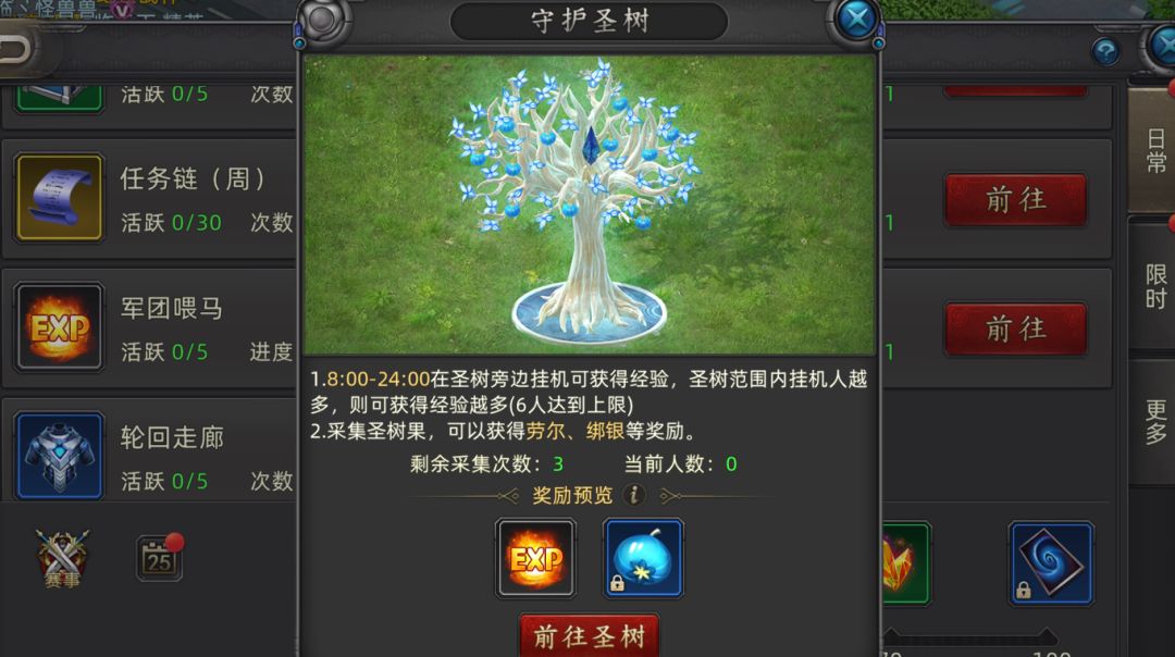 军团圣树:这就是个白嫖经验的地方,人越多,经验加成越高。一般都是晚上8点活动前,大家在军团里集合的时候,往树底下一站就行,挂着经验就来了,然后直接去做8点的活动,一点不耽误。