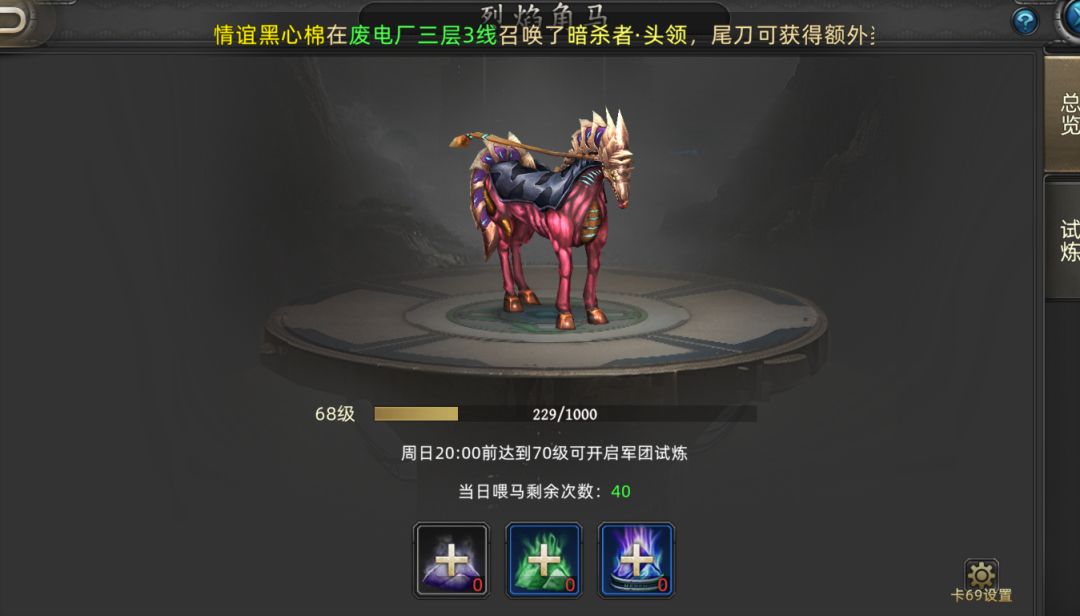 军团喂马:这个每天上线顺手就能点,最多能点40次,但我个人推荐点个20次就够了,性价比最高。用什么饲料喂,看你自己钱包,我一般都是用混合饲料。