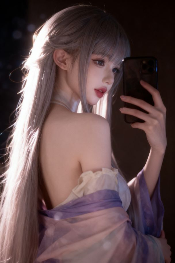 【生成真人化图像,这是一张写真风格的图片,质感光照和自然光线带来满满的摄影质感,还融入了朦胧感。呈现图中(女子)/(男子)手持手机对镜自拍的场景。背景为暗调、氛围感拉满的风格,搭配柔和且富有戏剧性的光线,突出她白皙的肌肤、好看的唇形与细腻的手部细节。融入带有朦胧感的梦幻艺术感,同时结合真实自然的光线,在写实与艺术感间达到平衡,画面比例为 2:3。】