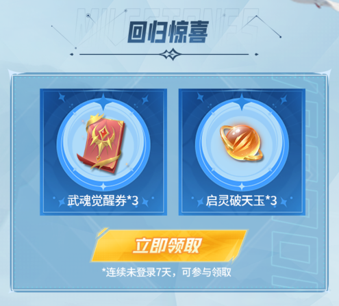 连续7天未登录,可免费领取武魂觉醒卷和启灵破天玉,助力魂师大大快速提升战力!